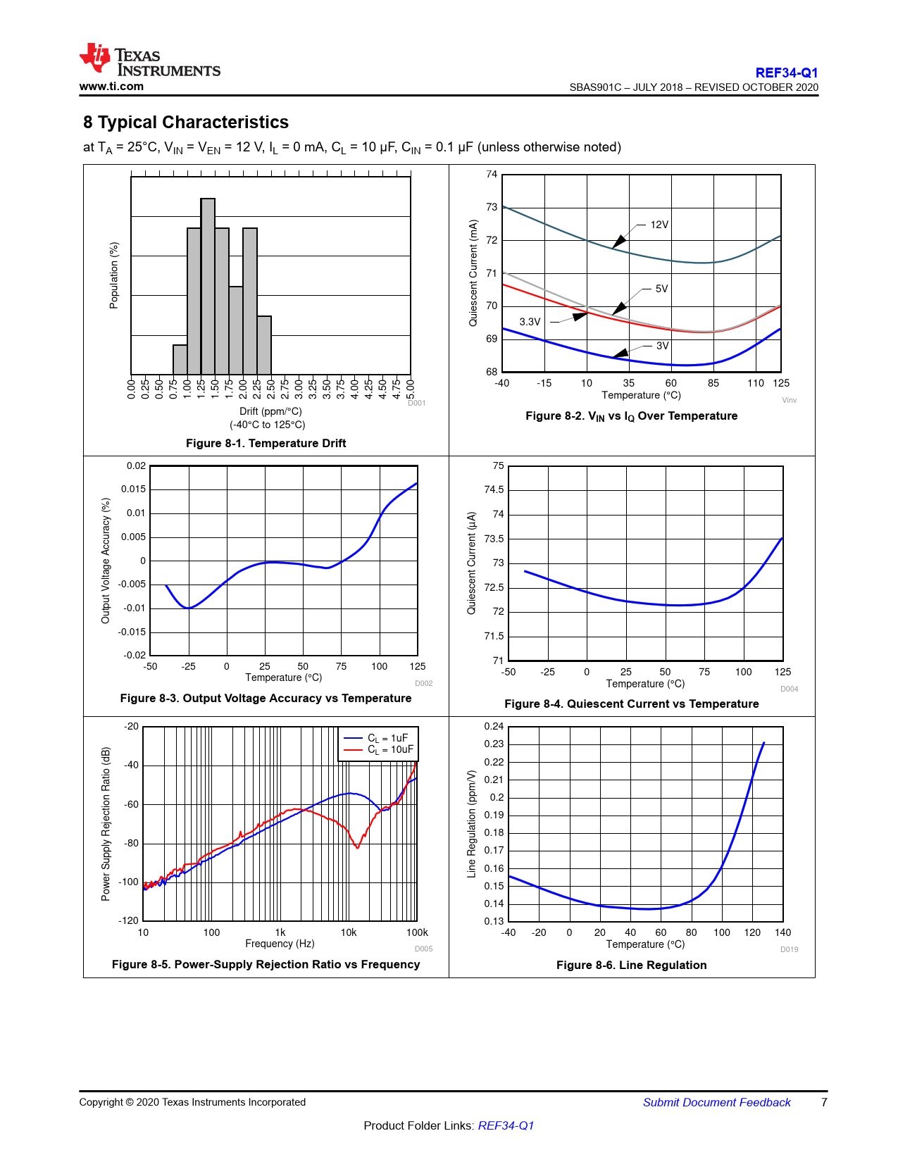 REF34-Q1. www.ti.com. 8 Typical Characteristics. Figure 8-2. VIN vs IQ Over Temperature. Figure 8-1. Temperature Drift
