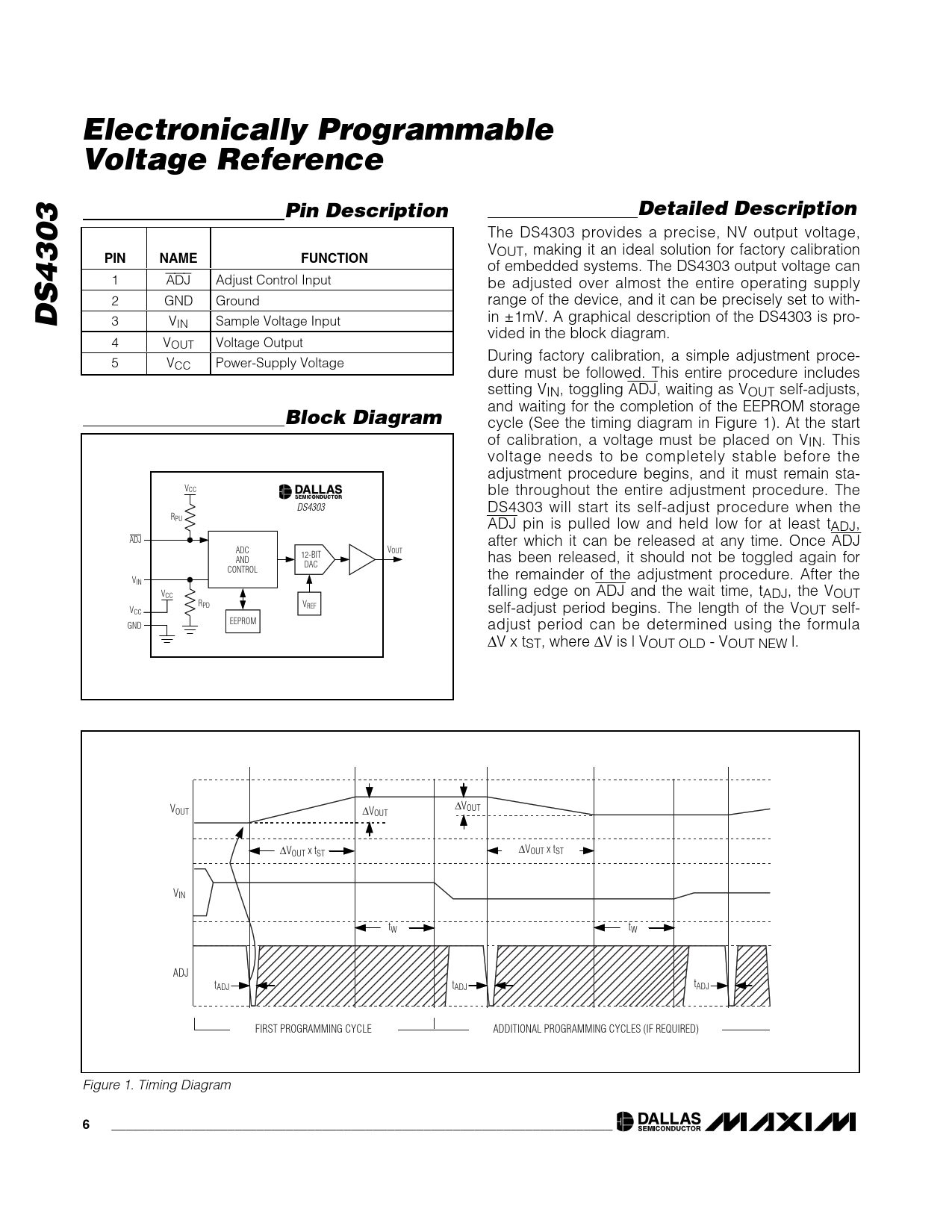 Electronically Programmable Voltage ReferencePin DescriptionDetailed Description The DS4303 provides a precise, NV output voltage, VOUT, making it an ideal solution for factory calibration PINNAMEFUNCTION of embedded systems. The DS4303 output voltage can 1 ADJ Adjust Control Input be adjusted over almost the entire operating supply 2 GND Ground range of the device, and it can be precisely set to with- DS4303 in ±1mV. A graphical description of the DS4303 is pro- 3 VIN Sample Voltage Input vided in the block diagram. 4 VOUT Voltage Output During factory calibration, a simple adjustment proce- 5 VCC Power-Supply Voltage dure must be followed. This entire procedure includes setting VIN, toggling ADJ, waiting as VOUT self-adjusts, and waiting for the completion of the EEPROM storage Block Diagram cycle (See the timing diagram in Figure 1). At the start of calibration, a voltage must be placed on VIN. This voltage needs to be completely stable before the adjustment procedure begins, and it must remain sta- VCC ble throughout the entire adjustment procedure. The DS4303 DS4303 will start its self-adjust procedure when the RPU ADJ pin is pulled low and held low for at least tADJ, ADJ after which it can be released at any time. Once ADJ ADC VOUT 12-BIT AND has been released, it should not be toggled again for DAC CONTROL the remainder of the adjustment procedure. After the VIN VCC falling edge on ADJ and the wait time, tADJ, the VOUT RPD VREF VCC self-adjust period begins. The length of the VOUT self- EEPROM GND adjust period can be determined using the formula ∆V x tST, where ∆V is | VOUT OLD - VOUT NEW |. V ∆V OUT ∆V OUT OUT ∆V ∆ OUT x tST VOUT x tST VIN tW tW ADJ tADJ tADJ tADJ FIRST PROGRAMMING CYCLE ADDITIONAL PROGRAMMING CYCLES (IF REQUIRED) Figure 1. Timing Diagram 6_____________________________________________________________________