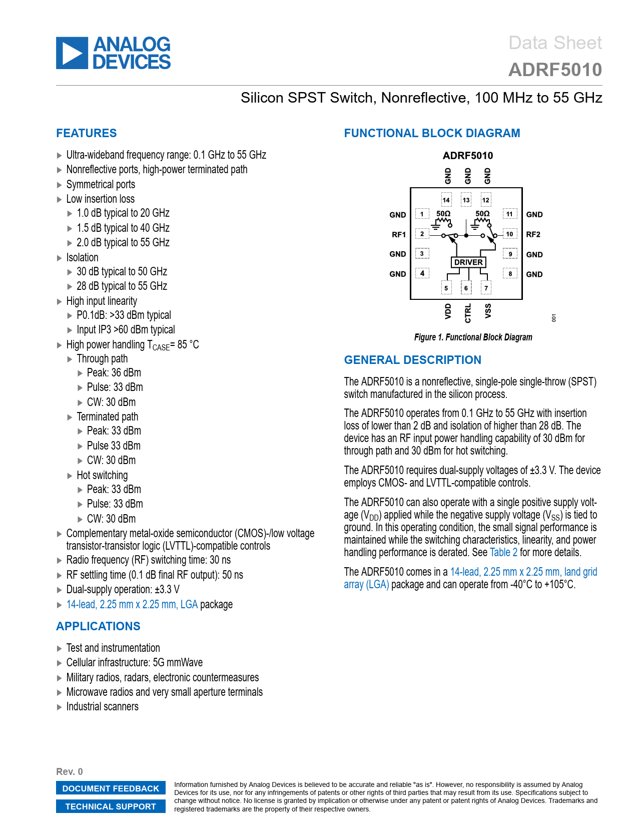 link to page 12 link to page 4 link to page 12 link to page 12 Data Sheet ADRF5010 Silicon SPST Switch, Nonreflective, 100 MHz to 55 GHz FEATURESFUNCTIONAL BLOCK DIAGRAM ► Ultra-wideband frequency range: 0.1 GHz to 55 GHz ► Nonreflective ports, high-power terminated path ► Symmetrical ports ► Low insertion loss ► 1.0 dB typical to 20 GHz ► 1.5 dB typical to 40 GHz ► 2.0 dB typical to 55 GHz ► Isolation ► 30 dB typical to 50 GHz ► 28 dB typical to 55 GHz ► High input linearity ► P0.1dB: >33 dBm typical ► Input IP3 >60 dBm typical Figure 1. Functional Block Diagram ► High power handling TCASE= 85 °C ► Through path GENERAL DESCRIPTION ► Peak: 36 dBm The ADRF5010 is a nonreflective, single-pole single-throw (SPST) ► Pulse: 33 dBm switch manufactured in the silicon process. ► CW: 30 dBm ► Terminated path The ADRF5010 operates from 0.1 GHz to 55 GHz with insertion loss of lower than 2 dB and isolation of higher than 28 dB. The ► Peak: 33 dBm device has an RF input power handling capability of 30 dBm for ► Pulse 33 dBm through path and 30 dBm for hot switching. ► CW: 30 dBm The ADRF5010 requires dual-supply voltages of ±3.3 V. The device ► Hot switching employs CMOS- and LVTTL-compatible controls. ► Peak: 33 dBm ► Pulse: 33 dBm The ADRF5010 can also operate with a single positive supply volt- ► CW: 30 dBm age (VDD) applied while the negative supply voltage (VSS) is tied to ground. In this operating condition, the small signal performance is ► Complementary metal-oxide semiconductor (CMOS)-/low voltage transistor-transistor logic (LVTTL)-compatible controls maintained while the switching characteristics, linearity, and power handling performance is derated. See Table 2 for more details. ► Radio frequency (RF) switching time: 30 ns ► RF settling time (0.1 dB final RF output): 50 ns The ADRF5010 comes in a 14-lead, 2.25 mm x 2.25 mm, land grid array (LGA) package and can operate from -40°C to +105°C. ► Dual-supply operation: ±3.3 V ► 14-lead, 2.25 mm x 2.25 mm, LGA package APPLICATIONS ► Test and instrumentation ► Cellular infrastructure: 5G mmWave ► Military radios, radars, electronic countermeasures ► Microwave radios and very small aperture terminals ► Industrial scanners Rev. 0DOCUMENT FEEDBACK Information furnished by Analog Devices is believed to be accurate and reliable "as is". However, no responsibility is assumed by Analog Devices for its use, nor for any infringements of patents or other rights of third parties that may result from its use. Specifications subject to change without notice. No license is granted by implication or otherwise under any patent or patent rights of Analog Devices. Trademarks and TECHNICAL SUPPORT registered trademarks are the property of their respective owners. Document Outline Features Applications Functional Block Diagram General Description Specifications Single-Supply Operation Absolute Maximum Ratings Thermal Resistance Power Derating Curves Electrostatıc Dıscharge (ESD) Ratıngs ESD Caution Pin Configuration and Function Descriptions Interface Schematics Typical Performance Characteristics Insertion Loss, Return Loss, and Isolation Input Power Compression and Third-Order Intercept Theory of Operation RF Input And Output Applications Information Evaluation Board Recommendatıons For Printed Circuit Board Design Outline Dimensions Ordering Guide Evaluation Boards