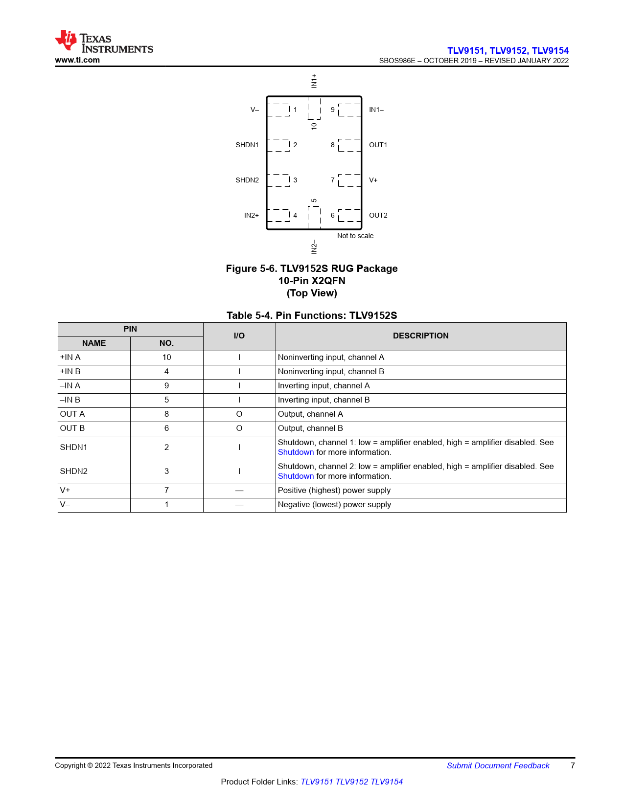 Figure 5-6. TLV9152S RUG Package 10-Pin X2QFN (Top View) Table 5-4. Pin Functions: TLV9152S PIN I/O DESCRIPTION NAME NO.