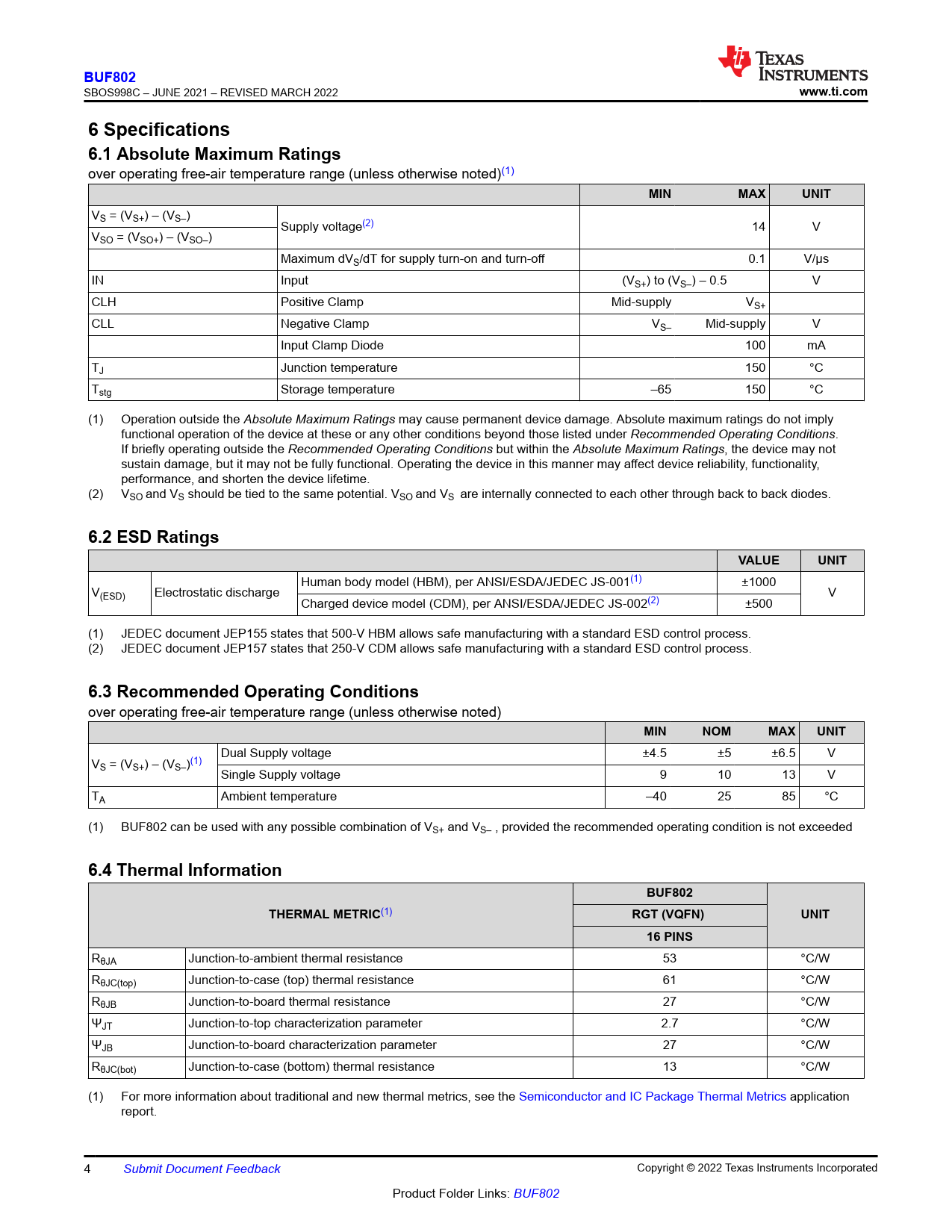 BUF802. www.ti.com. 6 Specifications 6.1 Absolute Maximum Ratings. MIN. MAX. UNIT. 6.2 ESD Ratings. VALUE