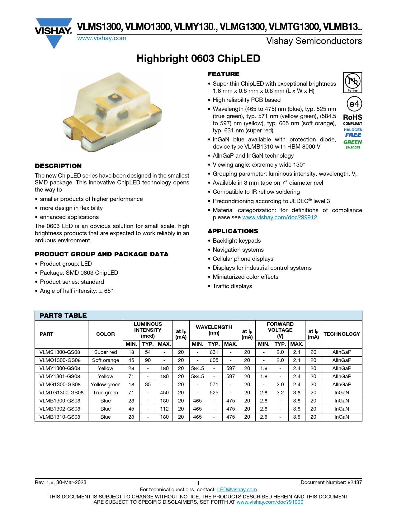 VLMS1300, VLMO1300, VLMY130., VLMG1300, VLMTG1300, VLMB13.. www.vishay.com Vishay Semiconductors Highbright 0603 ChipLEDFEATURE • Super thin ChipLED with exceptional brightness 1.6 mm x 0.8 mm x 0.8 mm (L x W x H) • High reliability PCB based • Wavelength (465 to 475) nm (blue), typ. 525 nm (true green), typ. 571 nm (yellow green), (584.5 to 597) nm (yellow), typ. 605 nm (soft orange), typ. 631 nm (super red) • InGaN blue available with protection diode, device type VLMB1310 with HBM 8000 V • AllnGaP and InGaN technology DESCRIPTION • Viewing angle: extremely wide 130° The new ChipLED series have been designed in the smallest • Grouping parameter: luminous intensity, wavelength, VF SMD package. This innovative ChipLED technology opens • Available in 8 mm tape on 7" diameter reel the way to • Compatible to IR reflow soldering • smaller products of higher performance • Preconditioning according to JEDEC® level 3 • more design in flexibility • Material categorization: for definitions of compliance • enhanced applications please see www.vishay.com/doc?99912 The 0603 LED is an obvious solution for small scale, high brightness products that are expected to work reliably in an APPLICATIONS arduous environment. • Backlight keypads • Navigation systems PRODUCT GROUP AND PACKAGE DATA • Cellular phone displays • Product group: LED • Displays for industrial control systems • Package: SMD 0603 ChipLED • Miniaturized color effects • Product series: standard • Traffic displays • Angle of half intensity: ± 65° PARTS TABLELUMINOUSFORWARDWAVELENGTHINTENSITYat IVOLTAGEat IPARTCOLORF(nm)at IFF(mcd)TECHNOLOGY(mA)(mA)(V)(mA)MIN.TYP. MAX.MIN.TYP. MAX.MIN.TYP. MAX. VLMS1300-GS08 Super red 18 54 - 20 - 631 - 20 - 2.0 2.4 20 AlInGaP VLMO1300-GS08 Soft orange 45 90 - 20 - 605 - 20 - 2.0 2.4 20 AlInGaP VLMY1300-GS08 Yellow 28 - 180 20 584.5 - 597 20 1.8 - 2.4 20 AlInGaP VLMY1301-GS08 Yellow 71 - 180 20 584.5 - 597 20 1.8 - 2.4 20 AlInGaP VLMG1300-GS08 Yellow green 18 35 - 20 - 571 - 20 - 2.0 2.4 20 AlInGaP VLMTG1300-GS08 True green 71 - 450 20 - 525 - 20 2.8 3.2 3.6 20 InGaN VLMB1300-GS08 Blue 28 - 180 20 465 - 475 20 2.8 - 3.8 20 InGaN VLMB1302-GS08 Blue 45 - 112 20 465 - 475 20 2.8 - 3.8 20 InGaN VLMB1310-GS08 Blue 28 - 180 20 465 - 475 20 2.8 - 3.8 20 InGaN Rev. 1.6, 30-Mar-2023 1 Document Number: 82437 For technical questions, contact: LED@vishay.com THIS DOCUMENT IS SUBJECT TO CHANGE WITHOUT NOTICE. THE PRODUCTS DESCRIBED HEREIN AND THIS DOCUMENT ARE SUBJECT TO SPECIFIC DISCLAIMERS, SET FORTH AT www.vishay.com/doc?91000
