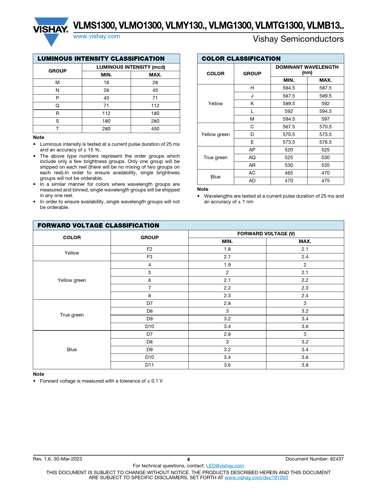 VLMS1300, VLMO1300, VLMY130., VLMG1300, VLMTG1300, VLMB13.. www.vishay.com Vishay Semiconductors LUMINOUS INTENSITY CLASSIFICATIONCOLOR CLASSIFICATIONLUMINOUS INTENSITY (mcd)DOMINANT WAVELENGTHGROUPMIN.MAX.COLORGROUP(nm) M 18 28 MIN.MAX. N 28 45 H 584.5 587.5 P 45 71 J 587.5 589.5 Q 71 112 Yellow K 589.5 592 R 112 180 L 592 594.5 S 180 280 M 594.5 597 T 280 450 C 567.5 570.5 Yellow green D 570.5 573.5 Note • Luminous intensity is tested at a current pulse duration of 25 ms E 573.5 576.5 and an accuracy of ± 15 %. AP 520 525 • The above type numbers represent the order groups which True green AQ 525 530 include only a few brightness groups. Only one group will be shipped on each reel (there will be no mixing of two groups on AR 530 535 each reel).In order to ensure availability, single brightness AC 465 470 groups will not be orderable. Blue AD 470 475 • In a similar manner for colors where wavelength groups are measured and binned, single wavelength groups will be shipped Note in any one reel. • Wavelengths are tested at a current pulse duration of 25 ms and • In order to ensure availability, single wavelength groups will not an accuracy of ± 1 nm be orderable. FORWARD VOLTAGE CLASSIFICATIONFORWARD VOLTAGE (V)COLORGROUPMIN.MAX. F2 1.8 2.1 Yellow F3 2.1 2.4 4 1.9 2 5 2 2.1 Yellow green 6 2.1 2.2 7 2.2 2.3 8 2.3 2.4 D7 2.8 3 D8 3 3.2 True green D9 3.2 3.4 D10 3.4 3.6 D7 2.8 3 D8 3 3.2 Blue D9 3.2 3.4 D10 3.4 3.6 D11 3.6 3.8 Note • Forward voltage is measured with a tolerance of ± 0.1 V Rev. 1.6, 30-Mar-2023 4 Document Number: 82437 For technical questions, contact: LED@vishay.com THIS DOCUMENT IS SUBJECT TO CHANGE WITHOUT NOTICE. THE PRODUCTS DESCRIBED HEREIN AND THIS DOCUMENT ARE SUBJECT TO SPECIFIC DISCLAIMERS, SET FORTH AT www.vishay.com/doc?91000
