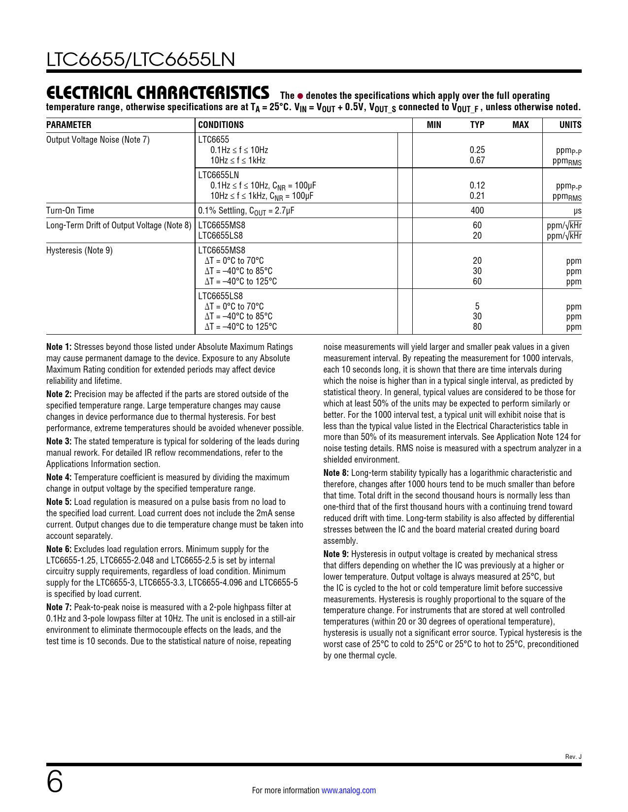 link to page 13 LTC6655/LTC6655LN ELECTRICAL CHARACTERISTICSThe l denotes the specifications which apply over the full operatingtemperature range, otherwise specifications are at TA = 25°C. VIN = VOUT + 0.5V, VOUT_S connected to VOUT_F , unless otherwise noted. PARAMETERCONDITIONSMINTYPMAXUNITS Output Voltage Noise (Note 7) LTC6655 0.1Hz ≤ f ≤ 10Hz 0.25 ppmP-P 10Hz ≤ f ≤ 1kHz 0.67 ppmRMS LTC6655LN 0.1Hz ≤ f ≤ 10Hz, CNR = 100µF 0.12 ppmP-P 10Hz ≤ f ≤ 1kHz, CNR = 100µF 0.21 ppmRMS Turn-On Time 0.1% Settling, COUT = 2.7µF 400 µs Long-Term Drift of Output Voltage (Note 8) LTC6655MS8 60 ppm/√kHr LTC6655LS8 20 ppm/√kHr Hysteresis (Note 9) LTC6655MS8 ∆T = 0°C to 70°C 20 ppm ∆T = –40°C to 85°C 30 ppm ∆T = –40°C to 125°C 60 ppm LTC6655LS8 ∆T = 0°C to 70°C 5 ppm ∆T = –40°C to 85°C 30 ppm ∆T = –40°C to 125°C 80 ppm Note 1: Stresses beyond those listed under Absolute Maximum Ratings noise measurements will yield larger and smaller peak values in a given may cause permanent damage to the device. Exposure to any Absolute measurement interval. By repeating the measurement for 1000 intervals, Maximum Rating condition for extended periods may affect device each 10 seconds long, it is shown that there are time intervals during reliability and lifetime. which the noise is higher than in a typical single interval, as predicted by Note 2: Precision may be affected if the parts are stored outside of the statistical theory. In general, typical values are considered to be those for specified temperature range. Large temperature changes may cause which at least 50% of the units may be expected to perform similarly or changes in device performance due to thermal hysteresis. For best better. For the 1000 interval test, a typical unit will exhibit noise that is performance, extreme temperatures should be avoided whenever possible. less than the typical value listed in the Electrical Characteristics table in Note 3: The stated temperature is typical for soldering of the leads during more than 50% of its measurement intervals. See Application Note 124 for manual rework. For detailed IR reflow recommendations, refer to the noise testing details. RMS noise is measured with a spectrum analyzer in a Applications Information section. shielded environment. Note 4: Temperature coefficient is measured by dividing the maximum Note 8: Long-term stability typically has a logarithmic characteristic and change in output voltage by the specified temperature range. therefore, changes after 1000 hours tend to be much smaller than before that time. Total drift in the second thousand hours is normally less than Note 5: Load regulation is measured on a pulse basis from no load to one-third that of the first thousand hours with a continuing trend toward the specified load current. Load current does not include the 2mA sense reduced drift with time. Long-term stability is also affected by differential current. Output changes due to die temperature change must be taken into stresses between the IC and the board material created during board account separately. assembly. Note 6: Excludes load regulation errors. Minimum supply for the Note 9: Hysteresis in output voltage is created by mechanical stress LTC6655-1.25, LTC6655-2.048 and LTC6655-2.5 is set by internal that differs depending on whether the IC was previously at a higher or circuitry supply requirements, regardless of load condition. Minimum lower temperature. Output voltage is always measured at 25°C, but supply for the LTC6655-3, LTC6655-3.3, LTC6655-4.096 and LTC6655-5 the IC is cycled to the hot or cold temperature limit before successive is specified by load current. measurements. Hysteresis is roughly proportional to the square of the Note 7: Peak-to-peak noise is measured with a 2-pole highpass filter at temperature change. For instruments that are stored at well controlled 0.1Hz and 3-pole lowpass filter at 10Hz. The unit is enclosed in a still-air temperatures (within 20 or 30 degrees of operational temperature), environment to eliminate thermocouple effects on the leads, and the hysteresis is usually not a significant error source. Typical hysteresis is the test time is 10 seconds. Due to the statistical nature of noise, repeating worst case of 25°C to cold to 25°C or 25°C to hot to 25°C, preconditioned by one thermal cycle. Rev. J 6 For more information www.analog.com Document Outline Features Applications Typical Application Description Absolute Maximum Ratings Pin Configuration Order Information Available Options Electrical Characteristics Typical Performance Characteristics Pin Functions Block Diagram Applications Information Typical Applications Package Description Revision History Typical Application Related Parts