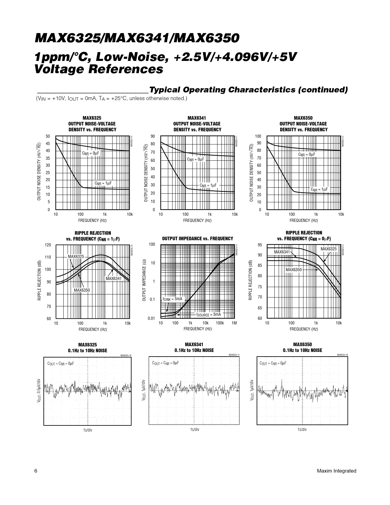 120 100 95 MAX6325 MAX6341 MAX6325-13 MAX6325-14 90 MAX6325-15 110 MAX6325 ) Ω 10 85 100 MAX6350 80 MAX6341 90 1 75 MAX6350 80 70 RIPPLE REJECTION (dB) OUTPUT IMPEDANCE ( 0.1 ISINK = 5mA RIPPLE REJECTION (dB) 70 65 ISOURCE = 5mA 60 0.01 60 10 100 1k 10k 10 100 1k 10k 100k 1M 10 100 1k 10k FREQUENCY (Hz) FREQUENCY (Hz) FREQUENCY (Hz)
