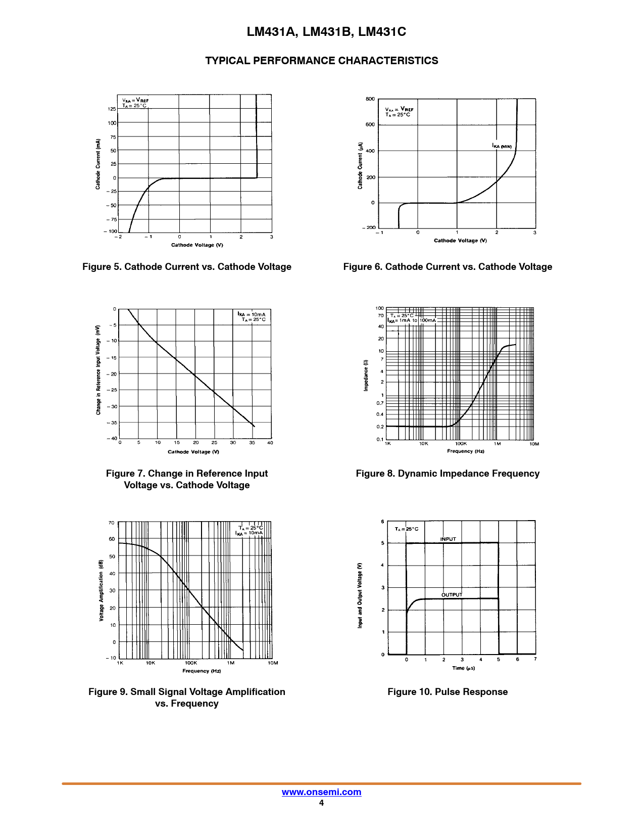 LM431A, LM431B, LM431C TYPICAL PERFORMANCE CHARACTERISTICS Figure 5. Cathode Current vs. Cathode Voltage Figure 6. Cathode Current vs. Cathode Voltage Figure 7. Change in Reference Input Figure 8. Dynamic Impedance Frequency Voltage vs. Cathode Voltage Figure 9. Small Signal Voltage Amplification Figure 10. Pulse Response vs. Frequency www.onsemi.com 4