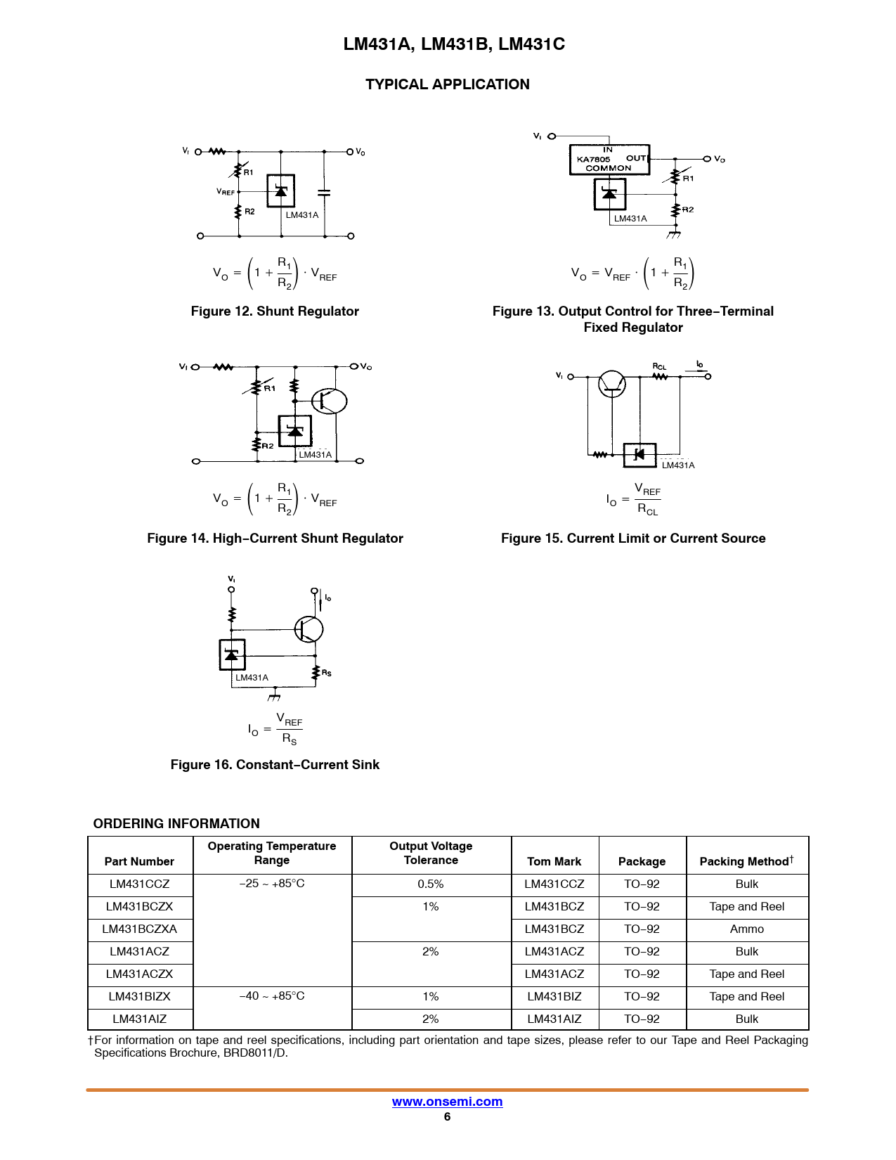 LM431A, LM431B, LM431CTYPICAL APPLICATION LM431A LM431A R R V 1Ǔ @ V V 1 O + ǒ1 ) R REF Ǔ O + VREF @ ǒ1 ) R 2 2 Figure 12. Shunt RegulatorFigure 13. Output Control for Three−TerminalFixed Regulator LM431A LM431A R V V 1Ǔ @ V I REF O + ǒ1 ) REF O + R R 2 CL Figure 14. High−Current Shunt RegulatorFigure 15. Current Limit or Current Source LM431A V I REF O + RS Figure 16. Constant−Current SinkORDERING INFORMATIONOperating TemperatureOutput VoltagePart NumberRangeToleranceTom MarkPackagePacking Method † LM431CCZ −25 ~ +85°C 0.5% LM431CCZ TO−92 Bulk LM431BCZX 1% LM431BCZ TO−92 Tape and Reel LM431BCZXA LM431BCZ TO−92 Ammo LM431ACZ 2% LM431ACZ TO−92 Bulk LM431ACZX LM431ACZ TO−92 Tape and Reel LM431BIZX −40 ~ +85°C 1% LM431BIZ TO−92 Tape and Reel LM431AIZ 2% LM431AIZ TO−92 Bulk †For information on tape and reel specifications, including part orientation and tape sizes, please refer to our Tape and Reel Packaging Specifications Brochure, BRD8011/D. www.onsemi.com6