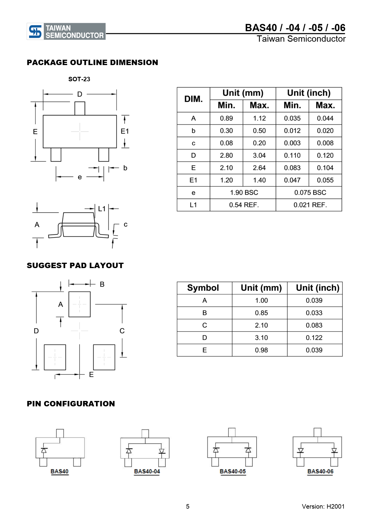 BAS40 / -04 / -05 / -06 Taiwan Semiconductor PACKAGE OUTLINE DIMENSION SOT-23 SUGGEST PAD LAYOUT PIN CONFIGURATION 5 Version: H2001
