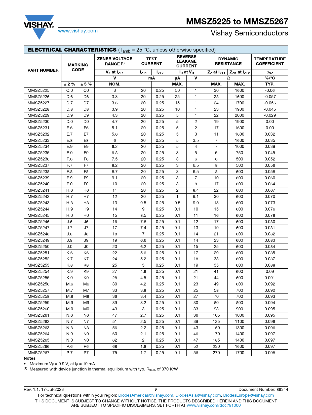 MMSZ5225 C.0 C0 3 20 0.25 50 1 30 1600 -0.06 MMSZ5226 D.6 D6 3.3 20 0.25 25 1 28 1600 -0.057 MMSZ5227 D.7 D7 3.6 20 0.25 15 1 24 1700 -0.056 MMSZ5228 D.8 D8 3.9 20 0.25 10 1 23 1900 -0.045 MMSZ5229 D.9 D9 4.3 20 0.25 5 1 22 2000 -0.029 MMSZ5230 D.0 D0 4.7 20 0.25 5 2 19 1900 0.00 MMSZ5231 E.6 E6 5.1 20 0.25 5 2 17 1600 0.00 MMSZ5232 E.7 E7 5.6 20 0.25 5 3 11 1600 0.032 MMSZ5233 E.8 E8 6 20 0.25 5 3.5 7 1600 0.035 MMSZ5234 E.9 E9 6.2 20 0.25 5 4 7 1000 0.039 MMSZ5235 E.0 E0 6.8 20 0.25 3 5 5 750 0.045 MMSZ5236 F.6 F6 7.5 20 0.25 3 6 6 500 0.052 MMSZ5237 F.7 F7 8.2 20 0.25 3 6.5 8 500 0.056 MMSZ5238 F.8 F8 8.7 20 0.25 3 6.5 8 600 0.058 MMSZ5239 F.9 F9 9.1 20 0.25 3 7 10 600 0.060 MMSZ5240 F.0 F0 10 20 0.25 3 8 17 600 0.064 MMSZ5241 H.6 H6 11 20 0.25 2 8.4 22 600 0.067 MMSZ5242 H.7 H7 12 20 0.25 1 9.1 30 600 0.070 MMSZ5243 H.8 H8 13 9.5 0.25 0.5 9.9 13 600 0.073 MMSZ5244 H.9 H9 14 9 0.25 0.1 10 15 600 0.076 MMSZ5245 H.0 H0 15 8.5 0.25 0.1 11 16 600 0.078 MMSZ5246 J.6 J6 16 7.8 0.25 0.1 12 17 600 0.080 MMSZ5247 J.7 J7 17 7.4 0.25 0.1 13 19 600 0.081 MMSZ5248 J.8 J8 18 7 0.25 0.1 14 21 600 0.082 MMSZ5249 J.9 J9 19 6.6 0.25 0.1 14 23 600 0.083 MMSZ5250 J.0 J0 20 6.2 0.25 0.1 15 25 600 0.084 MMSZ5251 K.6 K6 22 5.6 0.25 0.1 17 29 600 0.085 MMSZ5252 K.7 K7 24 5.2 0.25 0.1 18 33 600 0.087 MMSZ5253 K.8 K8 25 5 0.25 0.1 19 35 600 0.088 MMSZ5254 K.9 K9 27 4.6 0.25 0.1 21 41 600 0.09 MMSZ5255 K.0 K0 28 4.5 0.25 0.1 21 44 600 0.091 MMSZ5256 M.6 M6 30 4.2 0.25 0.1 23 49 600 0.092 MMSZ5257 M.7 M7 33 3.8 0.25 0.1 25 58 700 0.092 MMSZ5258 M.8 M8 36 3.4 0.25 0.1 27 70 700 0.093 MMSZ5259 M.9 M9 39 3.2 0.25 0.1 30 80 800 0.094 MMSZ5260 M.0 M0 43 3 0.25 0.1 33 93 900 0.095 MMSZ5261 N.6 N6 47 2.7 0.25 0.1 36 105 1000 0.095 MMSZ5262 N.7 N7 51 2.5 0.25 0.1 39 125 1100 0.096 MMSZ5263 N.8 N8 56 2.2 0.25 0.1 43 150 1300 0.096 MMSZ5264 N.9 N9 60 2.1 0.25 0.1 46 170 1400 0.097 MMSZ5265 N.0 N0 62 2 0.25 0.1 47 185 1400 0.097 MMSZ5266 P.6 P6 68 1.8 0.25 0.1 52 230 1600 0.097 MMSZ5267 P.7 P7 75 1.7 0.25 0.1 56 270 1700 0.098