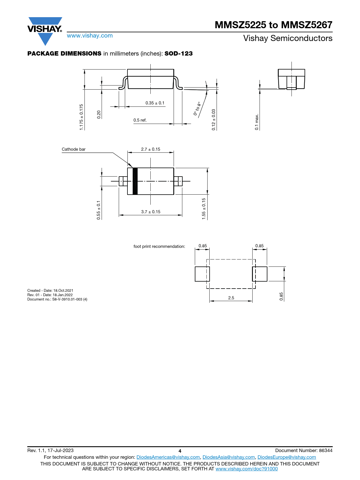0.35 ± 0.1 0° to 8° 0.20 0.5 ref. 1.175 ± 0.175 0.12 ± 0.03 0.1 max. Cathode bar 2.7 ± 0.15 3.7 ± 0.15 0.55 ± 0.1 1.55 ± 0.15 foot print recommendation: 0.85 0.85 Created - Date: 18.Oct.2021 Rev. 01 - Date: 18.Jan.2022 2.5 Document no.: S8-V-3910.01-003 (4) 0.85 Rev. 1.1, 17-Jul-2023