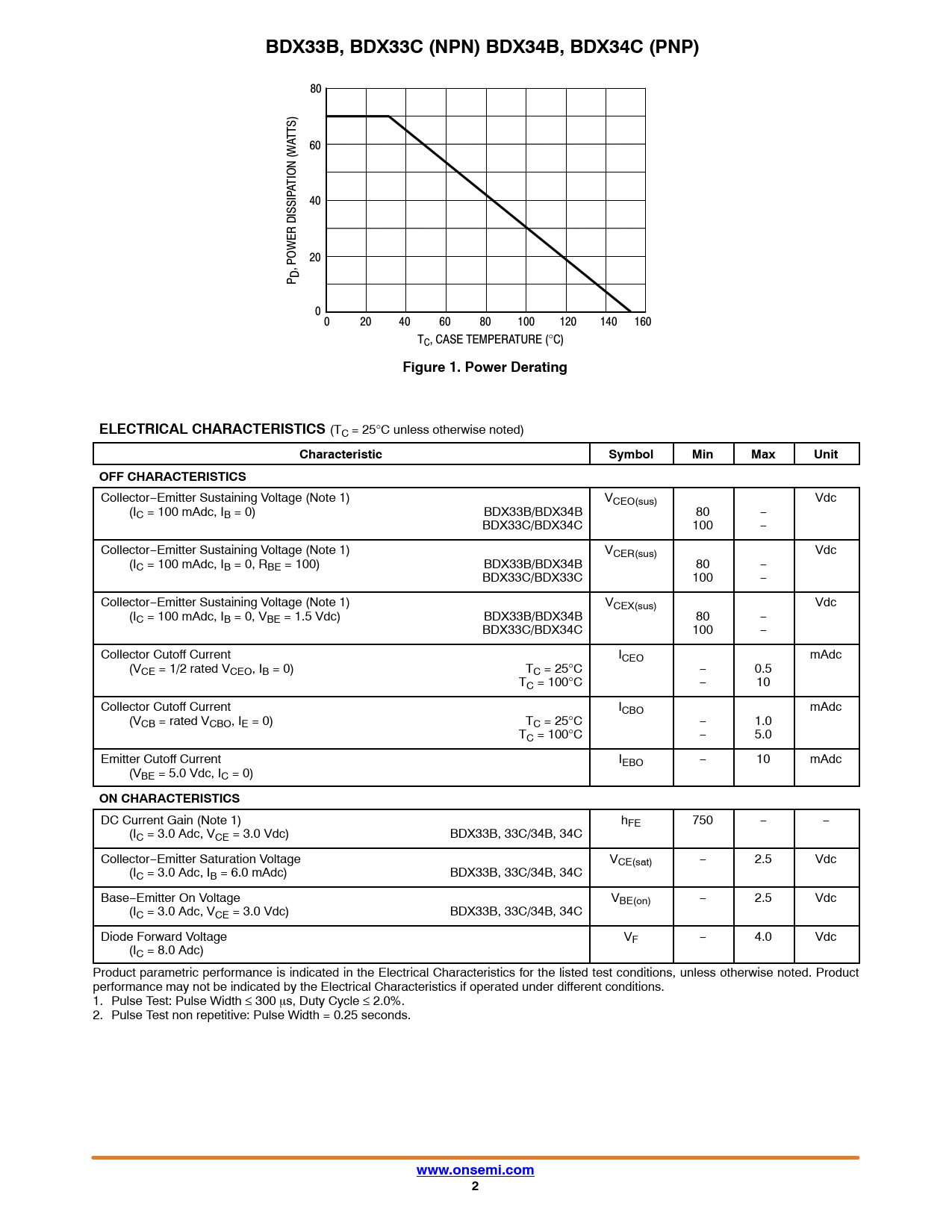 BDX33B, BDX33C (NPN) BDX34B, BDX34C (PNP). Figure 1. Power Derating. ELECTRICAL CHARACTERISTICS. Characteristic. Symbol. Min. Max