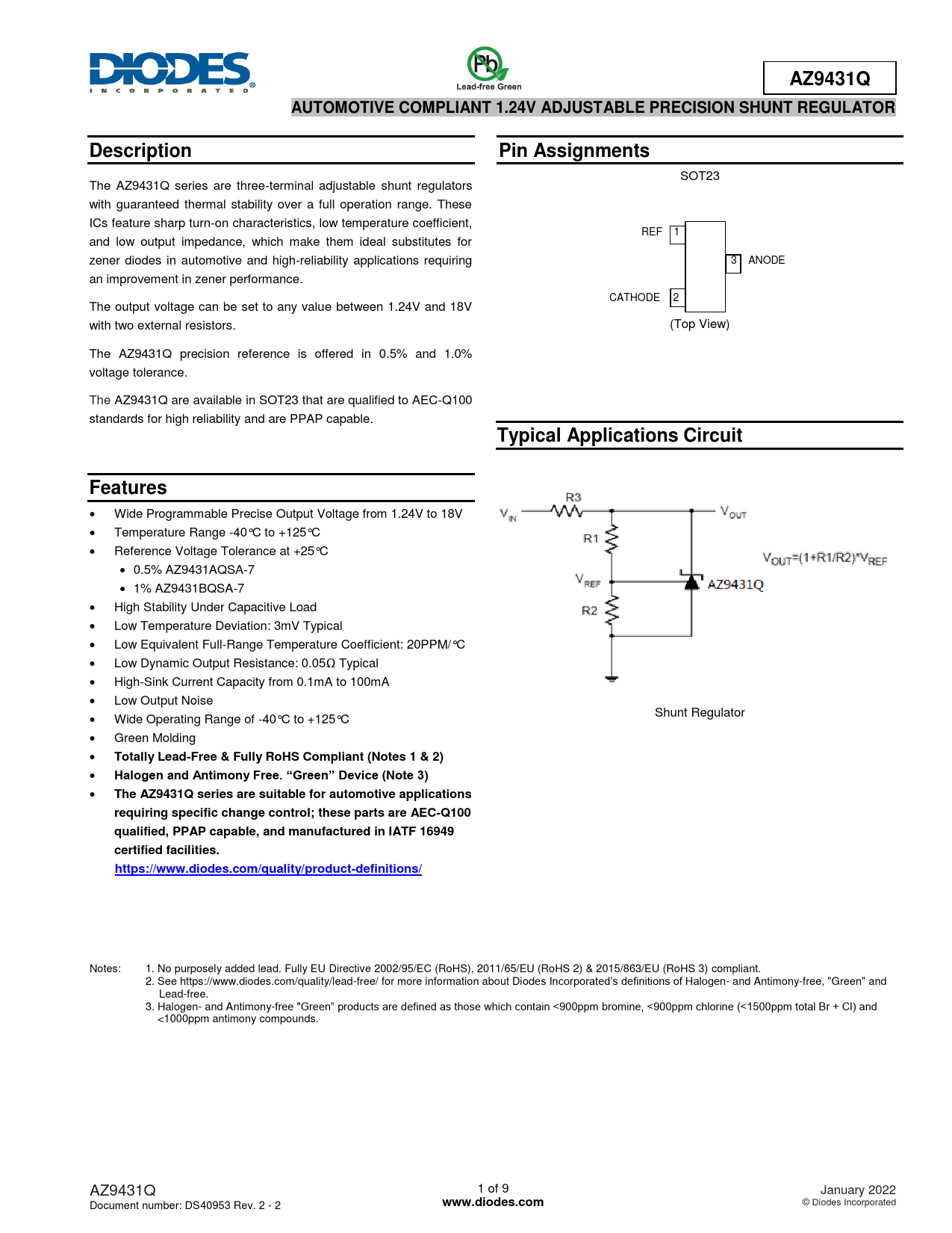 | Seiten / Seite | 9 / 1 — AZ9431Q. AUTOMOTIVE COMPLIANT 1.24V ADJUSTABLE PRECISION SHUNT REGULATOR. … |