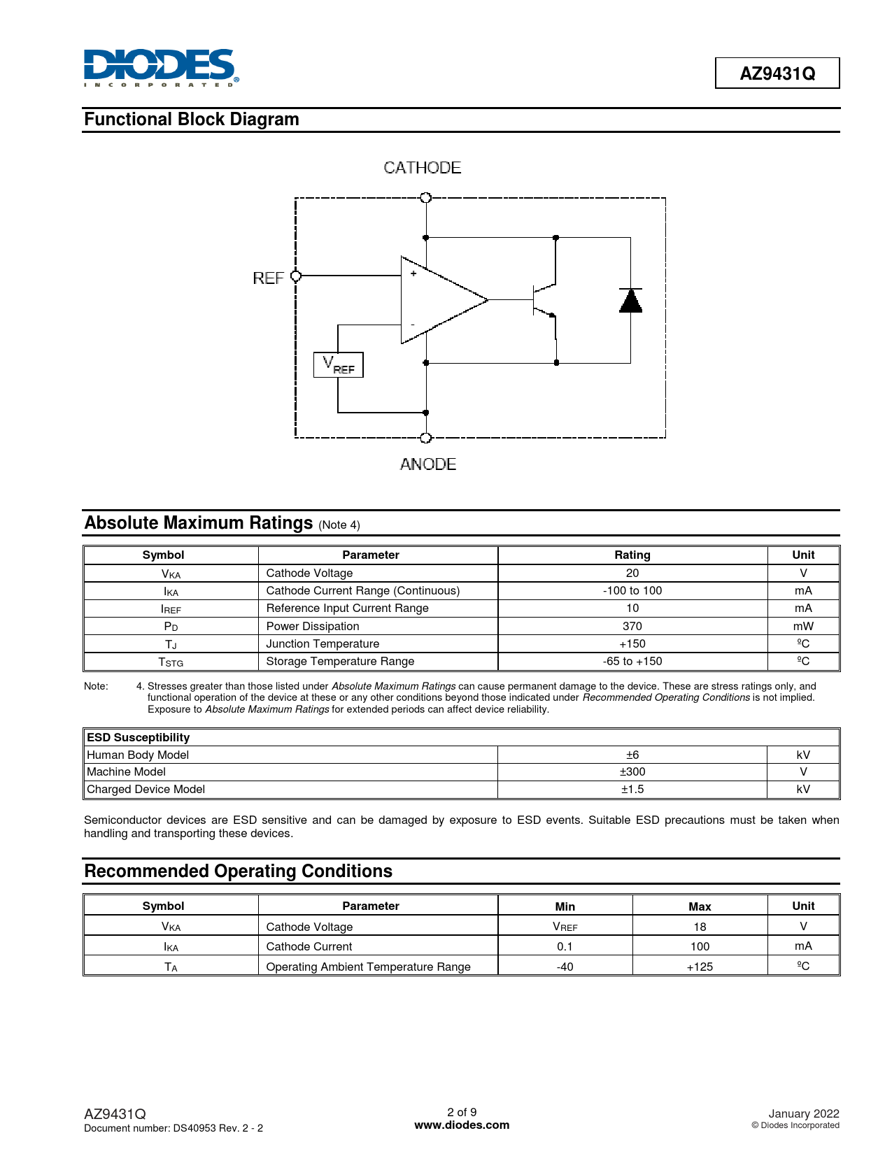 VKA Cathode Voltage VREF 18 V IKA Cathode Current 0.1 100 mA TA Operating Ambient Temperature Range -40 +125 ºC AZ9431Q 2 of 9 January 2022 Document number: DS40953 Rev. 2 - 2