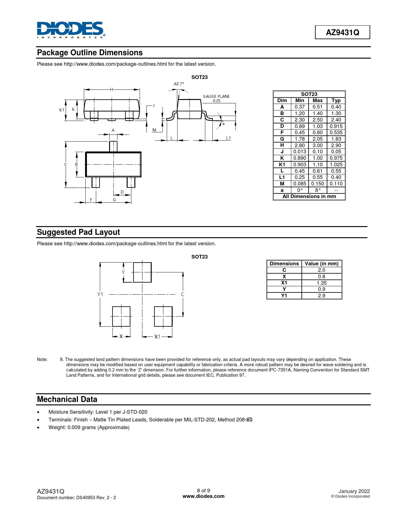 AZ9431Q. Package Outline Dimensions. SOT23. Dim. Min. Max. Typ. All Dimensions in mm. Suggested Pad Layout. Dimensions Value (in mm)