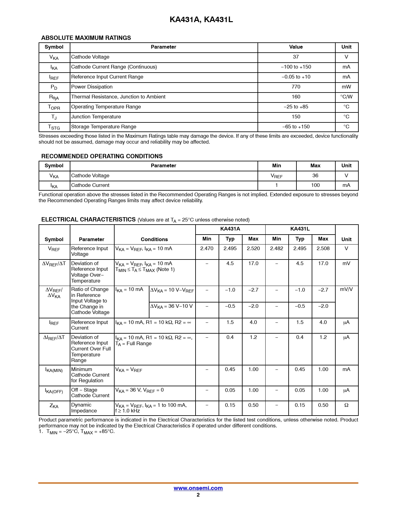 link to page 2 KA431A, KA431LABSOLUTE MAXIMUM RATINGSSymbolParameterValueUnit VKA Cathode Voltage 37 V IKA Cathode Current Range (Continuous) −100 to +150 mA IREF Reference Input Current Range −0.05 to +10 mA PD Power Dissipation 770 mW RθjA Thermal Resistance, Junction to Ambient 160 °C/W TOPR Operating Temperature Range −25 to +85 °C TJ Junction Temperature 150 °C TSTG Storage Temperature Range −65 to +150 °C Stresses exceeding those listed in the Maximum Ratings table may damage the device. If any of these limits are exceeded, device functionality should not be assumed, damage may occur and reliability may be affected. RECOMMENDED OPERATING CONDITIONSSymbolParameterMinMaxUnit VKA Cathode Voltage VREF 36 V IKA Cathode Current 1 100 mA Functional operation above the stresses listed in the Recommended Operating Ranges is not implied. Extended exposure to stresses beyond the Recommended Operating Ranges limits may affect device reliability. ELECTRICAL CHARACTERISTICS (Values are at TA = 25°C unless otherwise noted) KA431AKA431LSymbolParameterConditionsMinTypMaxMinTypMaxUnit VREF Reference Input VKA = VREF, IKA = 10 mA 2.470 2.495 2.520 2.482 2.495 2.508 V Voltage DVREF/DT Deviation of VKA = VREF, IKA = 10 mA − 4.5 17.0 − 4.5 17.0 mV Reference Input TMIN ≤ TA ≤ TMAX (Note 1) Voltage Over− Temperature DVREF/ Ratio of Change IKA = 10 mA DVKA = 10 V−VREF − −1.0 −2.7 − −1.0 −2.7 mV/V DVKA in Reference Input Voltage to the Change in DVKA = 36 V−10 V − −0.5 −2.0 − −0.5 −2.0 Cathode Voltage IREF Reference Input IKA = 10 mA, R1 = 10 kW, R2 = ∞ − 1.5 4.0 − 1.5 4.0 mA Current DIREF/DT Deviation of IKA = 10 mA, R1 = 10 kW, R2 = ∞, − 0.4 1.2 − 0.4 1.2 mA Reference Input TA = Full Range Current Over Full Temperature Range IKA(MIN) Minimum VKA = VREF − 0.45 1.00 − 0.45 1.00 mA Cathode Current for Regulation IKA(OFF) Off − Stage VKA = 36 V, VREF = 0 − 0.05 1.00 − 0.05 1.00 mA Cathode Current ZKA Dynamic VKA = VREF, IKA = 1 to 100 mA, − 0.15 0.50 − 0.15 0.50 W Impedance f ≥ 1.0 kHz Product parametric performance is indicated in the Electrical Characteristics for the listed test conditions, unless otherwise noted. Product performance may not be indicated by the Electrical Characteristics if operated under different conditions. 1. TMIN = −25°C, TMAX = +85°C. www.onsemi.com2