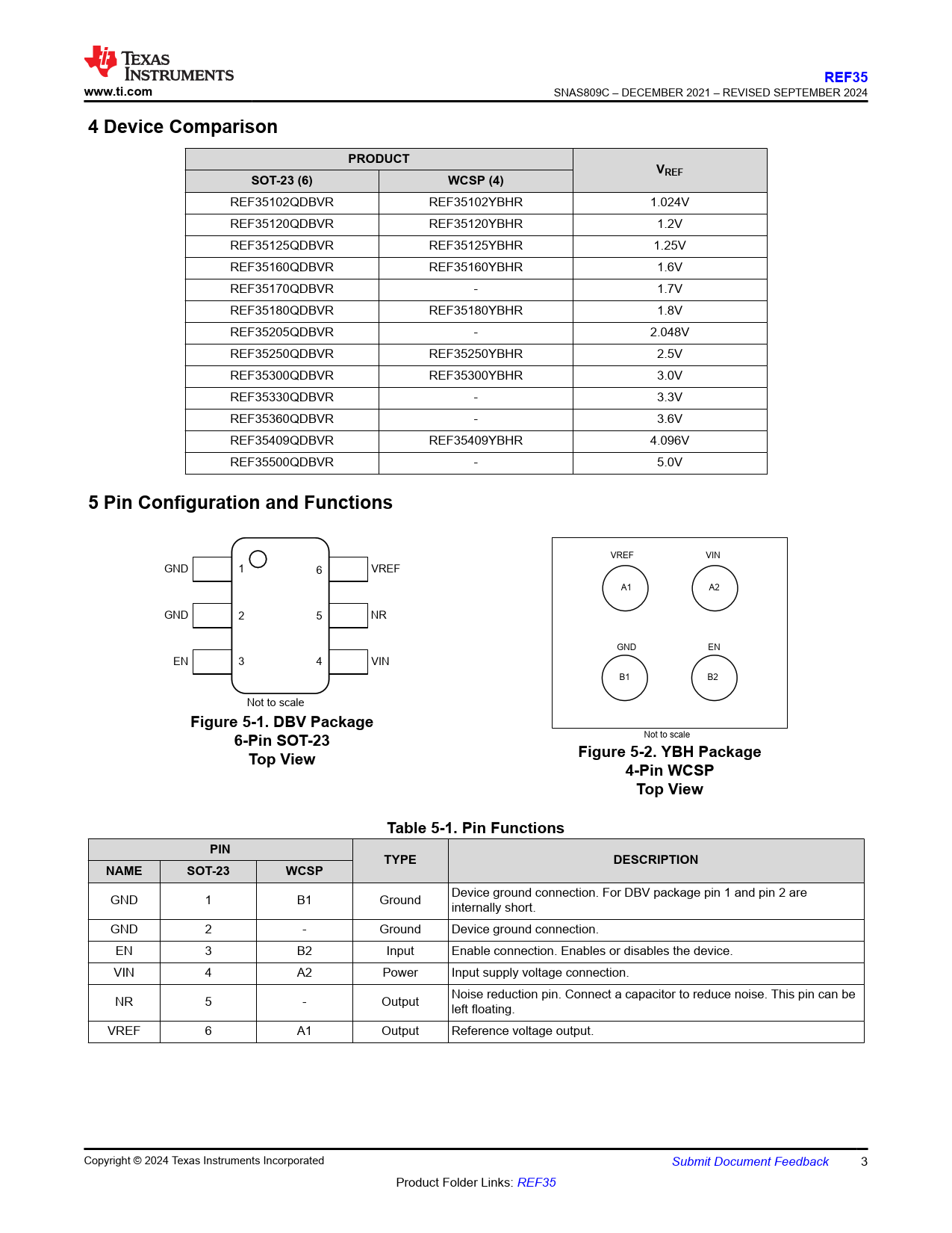 REF35. www.ti.com. 4 Device Comparison. PRODUCT. VREF. SOT-23 (6). WCSP (4). 5 Pin Configuration and Functions. Figure 5-1. DBV Package