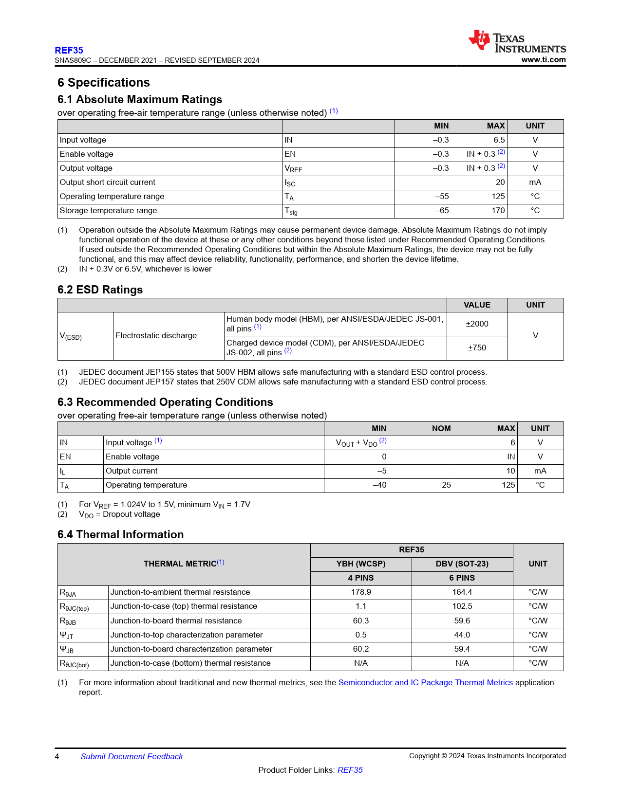 REF35. www.ti.com. 6 Specifications 6.1 Absolute Maximum Ratings. MIN. MAX. UNIT. 6.2 ESD Ratings. VALUE
