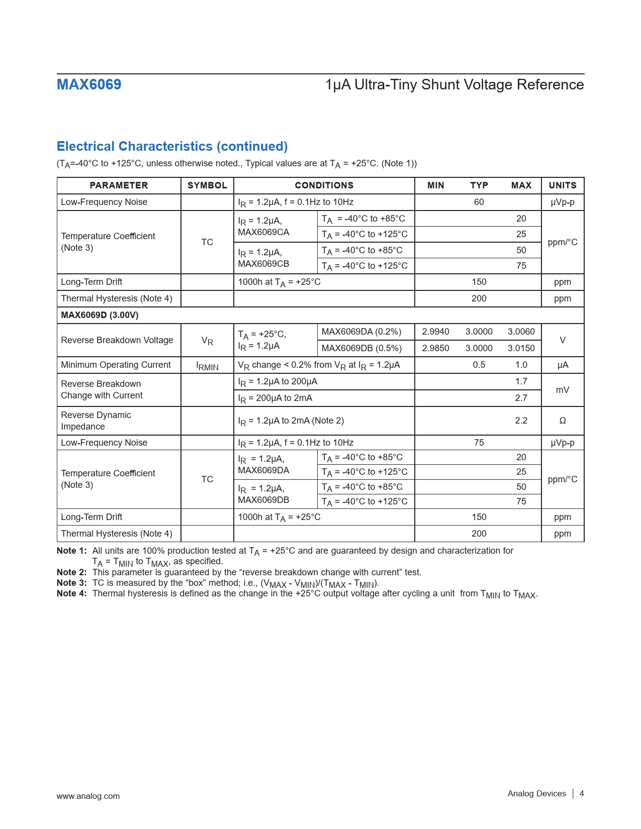 MAX6069 1μA Ultra-Tiny Shunt Voltage Reference Electrical Characteristics (continued) (TA=-40°C to +125°C, unless otherwise noted., Typical values are at TA = +25°C. (Note 1)) PARAMETERSYMBOLCONDITIONSMINTYPMAXUNITS Low-Frequency Noise IR = 1.2μA, f = 0.1Hz to 10Hz 60 µVp-p IR = 1.2µA, TA = -40°C to +85°C 20 Temperature Coefficient MAX6069CA TA = -40°C to +125°C 25 (Note 3) TC ppm/°C IR = 1.2µA, TA = -40°C to +85°C 50 MAX6069CB TA = -40°C to +125°C 75 Long-Term Drift 1000h at TA = +25°C 150 ppm Thermal Hysteresis (Note 4) 200 ppm MAX6069D (3.00V) MAX6069DA (0.2%) 2.9940 3.0000 3.0060 Reverse Breakdown Voltage V TA = +25°C, R I V R = 1.2µA MAX6069DB (0.5%) 2.9850 3.0000 3.0150 Minimum Operating Current IRMIN VR change < 0.2% from VR at IR = 1.2μA 0.5 1.0 µA Reverse Breakdown IR = 1.2μA to 200μA 1.7 Change with Current mV IR = 200μA to 2mA 2.7 Reverse Dynamic Impedance IR = 1.2μA to 2mA (Note 2) 2.2 Ω Low-Frequency Noise IR = 1.2μA, f = 0.1Hz to 10Hz 75 µVp-p IR = 1.2µA, TA = -40°C to +85°C 20 Temperature Coefficient MAX6069DA TA = -40°C to +125°C 25 (Note 3) TC ppm/°C IR = 1.2µA, TA = -40°C to +85°C 50 MAX6069DB TA = -40°C to +125°C 75 Long-Term Drift 1000h at TA = +25°C 150 ppm Thermal Hysteresis (Note 4) 200 ppm Note 1: All units are 100% production tested at TA = +25°C and are guaranteed by design and characterization for TA = TMIN to TMAX, as specified. Note 2: This parameter is guaranteed by the “reverse breakdown change with current” test. Note 3: TC is measured by the “box” method; i.e., (VMAX - VMIN)/(TMAX - TMIN). Note 4: Thermal hysteresis is defined as the change in the +25°C output voltage after cycling a unit from TMIN to TMAX. www.analog.com Analog Devices │ 4