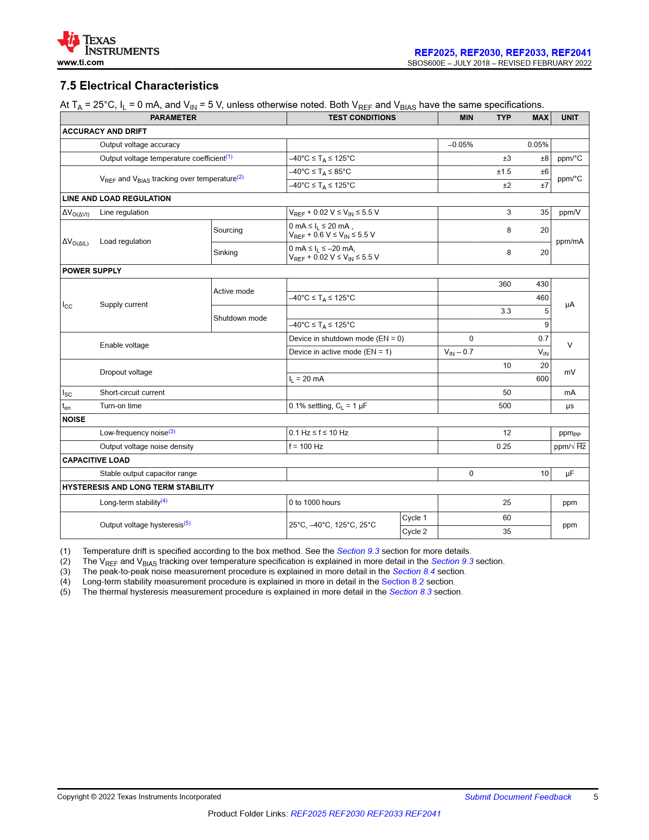 | Seiten / Seite | 35 / 5 — REF2025, REF2030, REF2033. , REF2041. www.ti.com. 7.5 Electrical … |