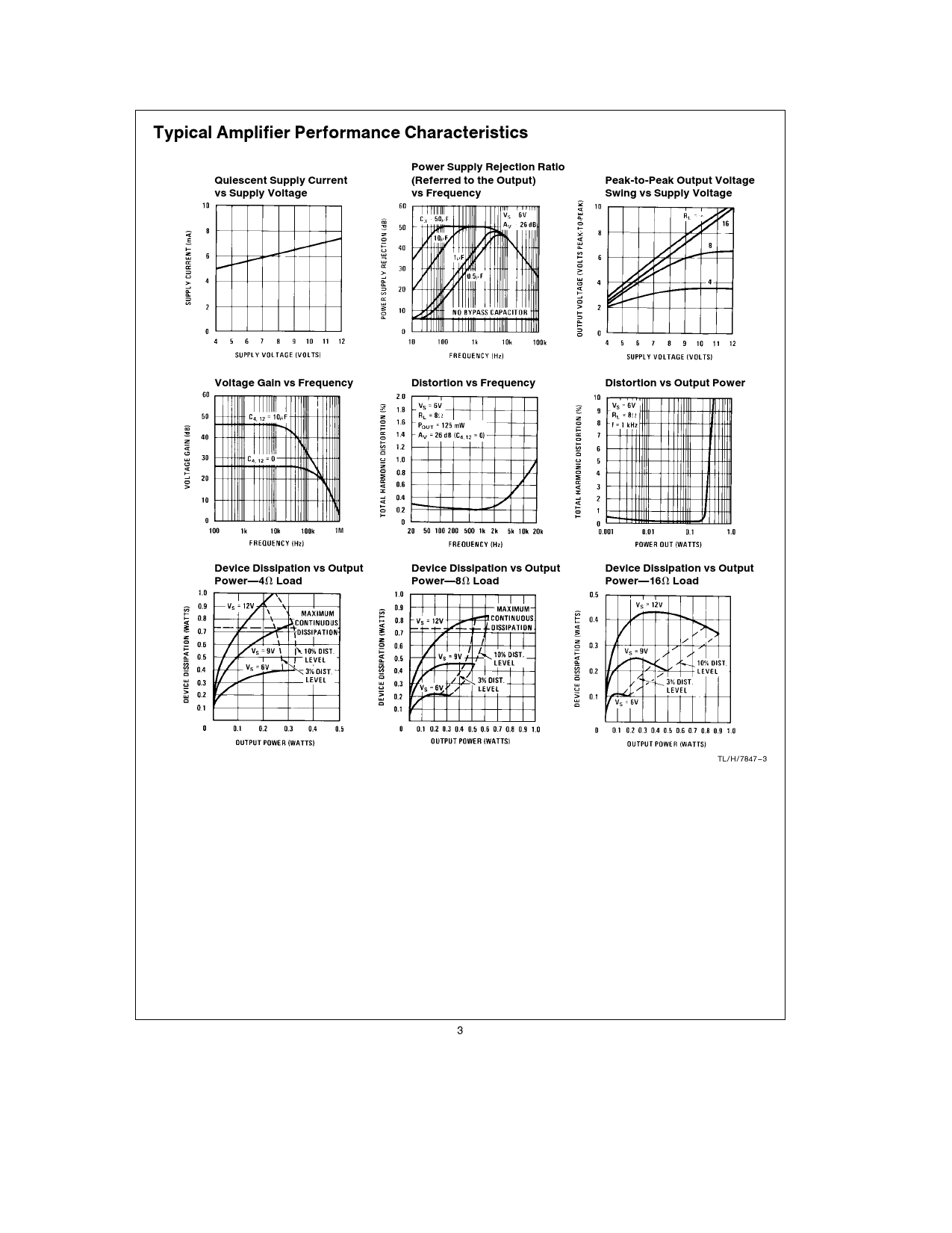 Typical Amplifier Performance Characteristics Power Supply Rejection Ratio Quiescent Supply Current (Referred to the Output) Peak-to-Peak Output Voltage vs Supply Voltage vs Frequency Swing vs Supply Voltage Voltage Gain vs Frequency Distortion vs Frequency Distortion vs Output Power Device Dissipation vs Output Device Dissipation vs Output Device Dissipation vs Output PowerÐ4X Load PowerÐ8X Load PowerÐ16X Load TL/H/7847 – 3 3