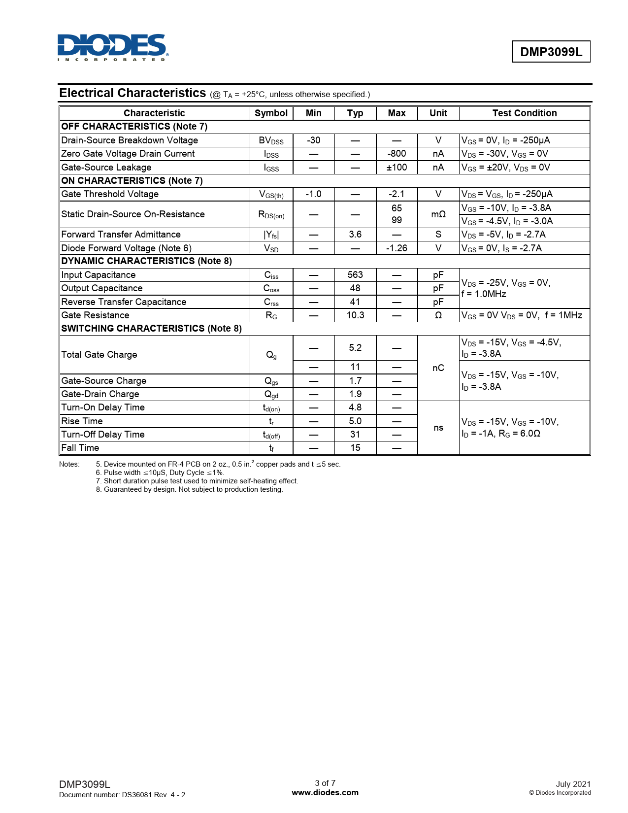 DMP3099L. Electrical Characteristics. Characteristic. Symbol. Min. Typ. Max. Unit. Test Condition. OFF CHARACTERISTICS (Note 7)