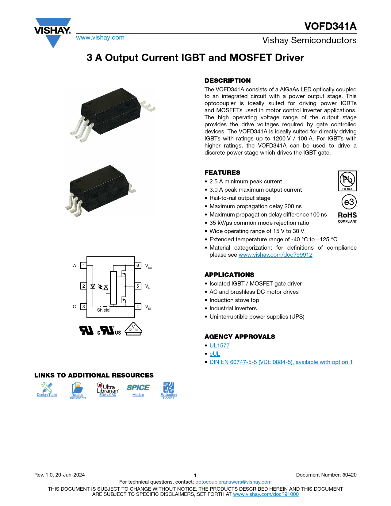 VOFD341A www.vishay.com Vishay Semiconductors 3 A Output Current IGBT and MOSFET DriverDESCRIPTION The VOFD341A consists of a AlGaAs LED optically coupled to an integrated circuit with a power output stage. This optocoupler is ideally suited for driving power IGBTs and MOSFETs used in motor control inverter applications. The high operating voltage range of the output stage provides the drive voltages required by gate controlled devices. The VOFD341A is ideally suited for directly driving IGBTs with ratings up to 1200 V / 100 A. For IGBTs with higher ratings, the VOFD341A can be used to drive a discrete power stage which drives the IGBT gate. FEATURES • 2.5 A minimum peak current • 3.0 A peak maximum output current • Rail-to-rail output stage • Maximum propagation delay 200 ns • Maximum propagation delay difference 100 ns • 35 kV/μs common mode rejection ratio • Wide operating range of 15 V to 30 V • Extended temperature range of -40 °C to +125 °C • Material categorization: for definitions of compliance please see www.vishay.com/doc?99912 A 1 6 VCC APPLICATIONS • Isolated IGBT / MOSFET gate driver 2 5 VO • AC and brushless DC motor drives • Induction stove top C 3 4 VEE Shield • Industrial inverters • Uninterruptible power supplies (UPS) V D E AGENCY APPROVALS • UL1577 • cUL • DIN EN 60747-5-5 (VDE 0884-5), available with option 1 LINKS TO ADDITIONAL RESOURCESDesign ToolsRelatedEDA / CADModelsEvaluationDocumentsBoards Rev. 1.0, 20-Jun-2024 1 Document Number: 80420 For technical questions, contact: optocoupleranswers@vishay.com THIS DOCUMENT IS SUBJECT TO CHANGE WITHOUT NOTICE. THE PRODUCTS DESCRIBED HEREIN AND THIS DOCUMENT ARE SUBJECT TO SPECIFIC DISCLAIMERS, SET FORTH AT www.vishay.com/doc?91000