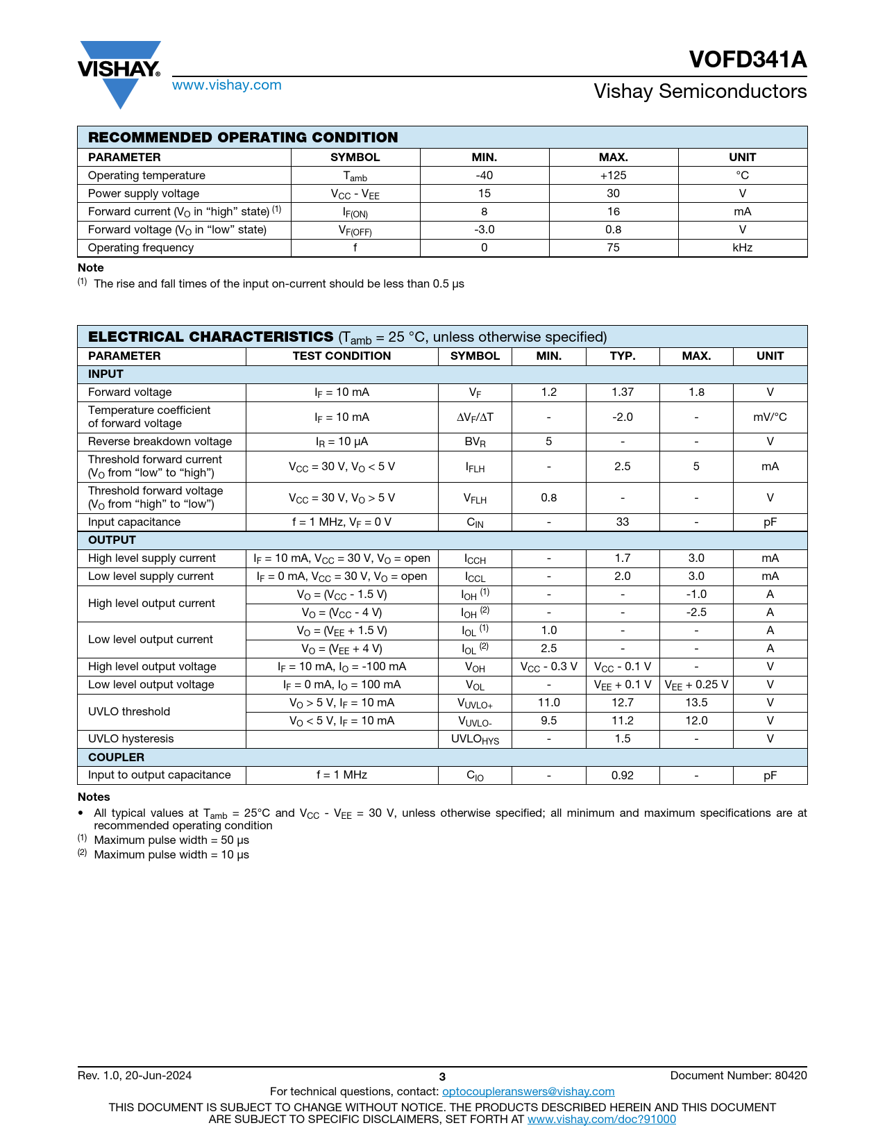 VOFD341A RECOMMENDED OPERATING CONDITION PARAMETER SYMBOL MIN MAX UNIT Note ELECTRICAL CHARACTERISTICS PARAMETER TEST CONDITION