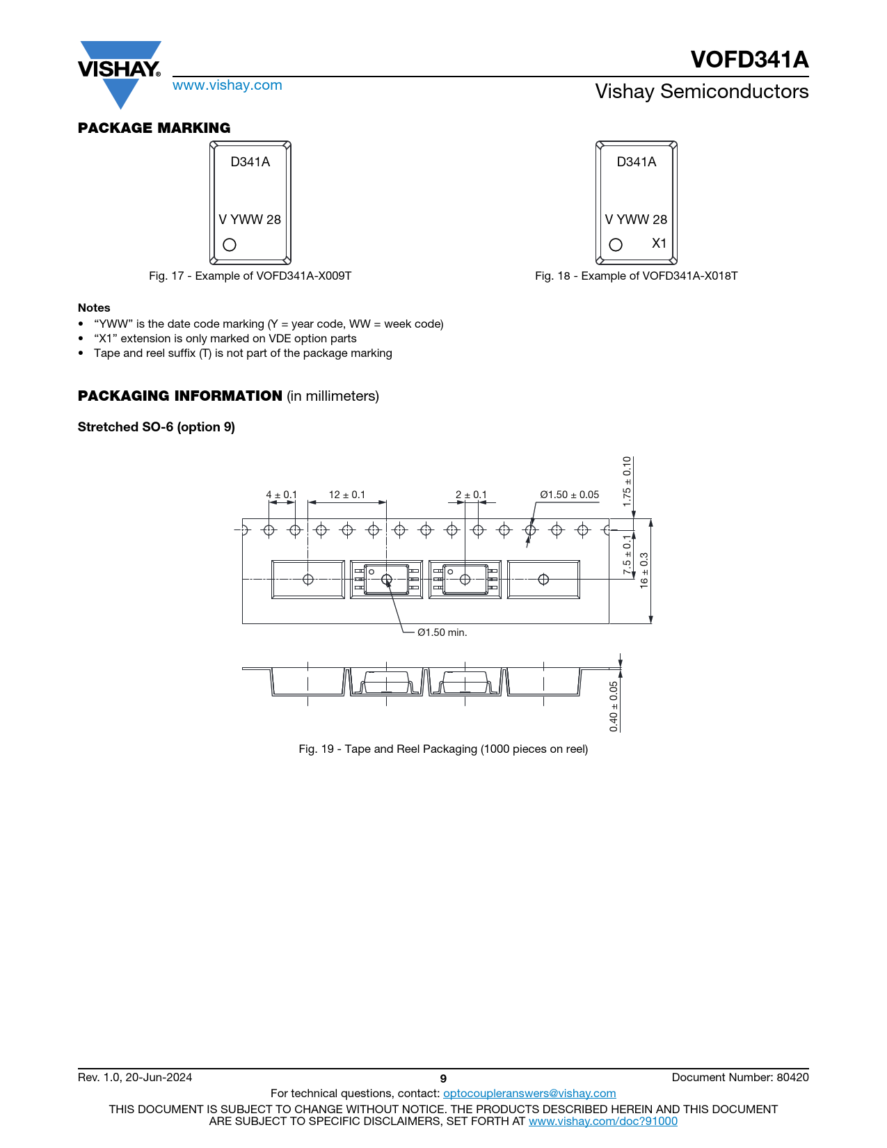 VOFD341A. PACKAGE MARKING. Notes. PACKAGING INFORMATION. Stretched SO-6 (option 9)