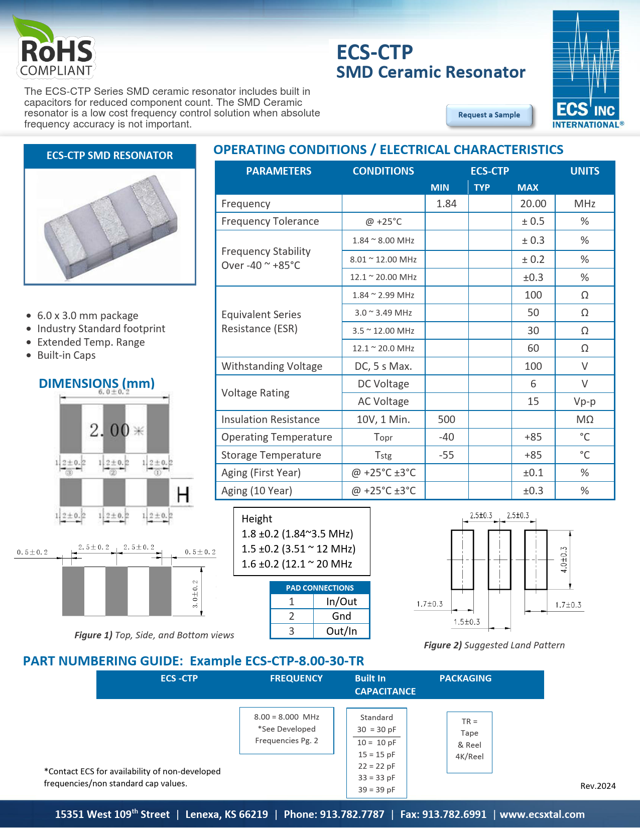 ECS-CTP. SMD Ceramic Resonator. Request a Sample. OPERATING CONDITIONS / ELECTRICAL CHARACTERISTICS. ECS-CTP SMD RESONATOR