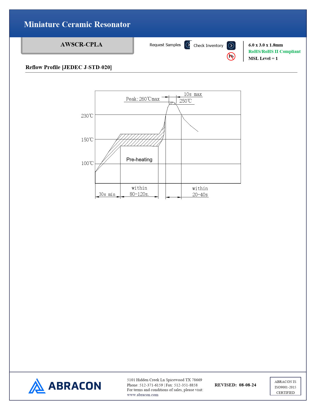 10s max Peak:260℃max 250℃ 230℃ 150℃ Pre-heating 100℃ within within 30s min 80-120s. 20-40s 5101 H idden Creek Ln Spicewood TX 78669 ABRACON IS Phone: 512-371-6159 | Fax: 512-351-8858