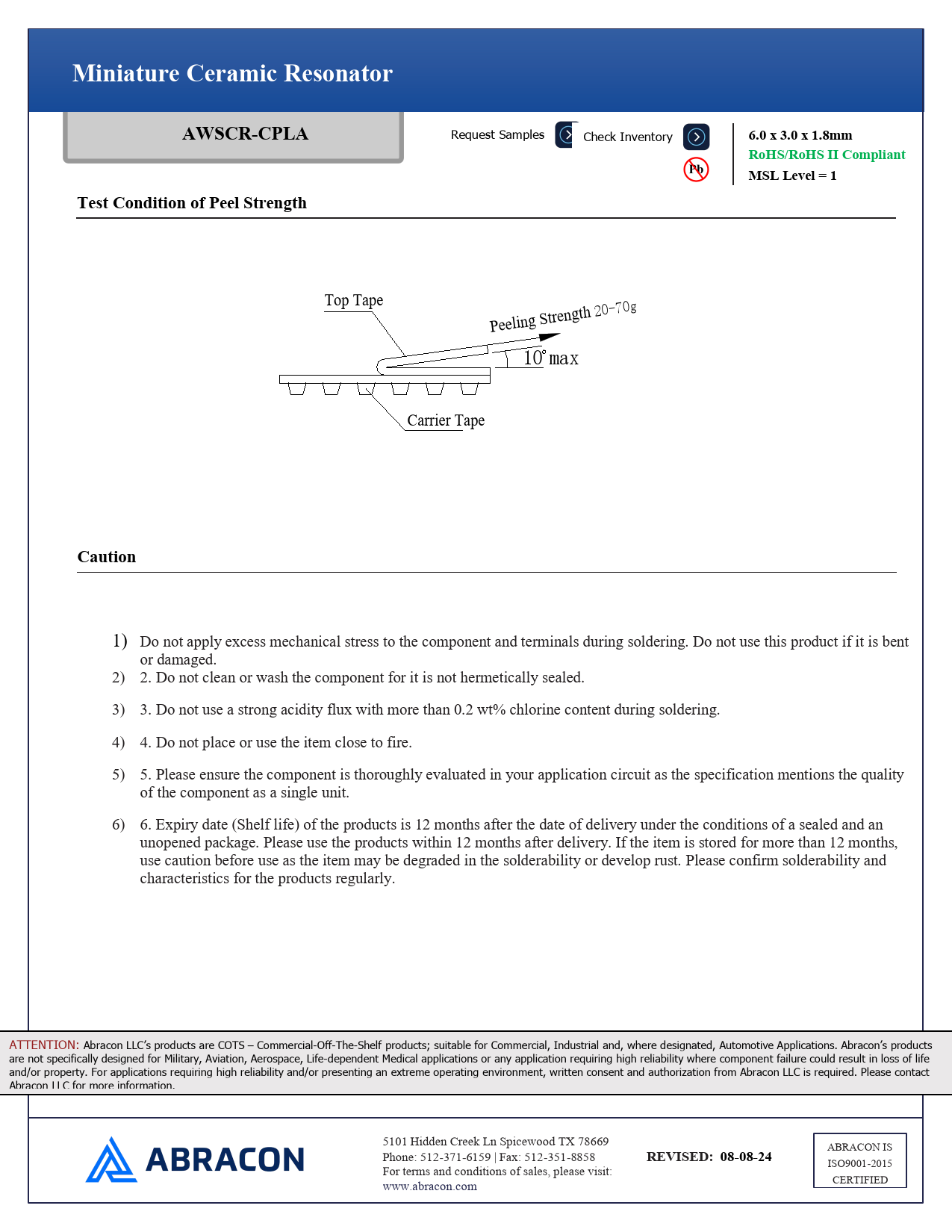 1) Do not apply excess mechanical stress to the component and terminals during soldering. Do not use this product if it is bent or damaged. 2) 2. Do not clean or wash the component for it is not hermetically sealed. 3) 3. Do not use a strong acidity flux with more than 0.2 wt% chlorine content during soldering. 4) 4. Do not place or use the item close to fire. 5) 5. Please ensure the component is thoroughly evaluated in your application circuit as the specification mentions the quality of the component as a single unit. 6) 6. Expiry date (Shelf life) of the products is 12 months after the date of delivery under the conditions of a sealed and an unopened package. Please use the products within 12 months after delivery. If the item is stored for more than 12 months, use caution before use as the item may be degraded in the solderability or develop rust. Please confirm solderability and characteristics for the products regularly. ATTENTION: Abracon LLC’s products are COTS – Commercial-Off-The-Shelf products; suitable for Commercial, Industrial and, where designated, Automotive Applications. Abracon’s products are not specifical y designed for Military, Aviation, Aerospace, Life-dependent Medical applications or any application requiring high reliability where component failure could result in loss of life and/or property. For applications requiring high reliability and/or presenting an extreme operating environment, written consent and authorization from Abracon LLC is required. Please contact Abracon LLC for more information. 5101 H idden Creek Ln Spicewood TX 78669 ABRACON IS Phone: 512-371-6159 | Fax: 512-351-8858
