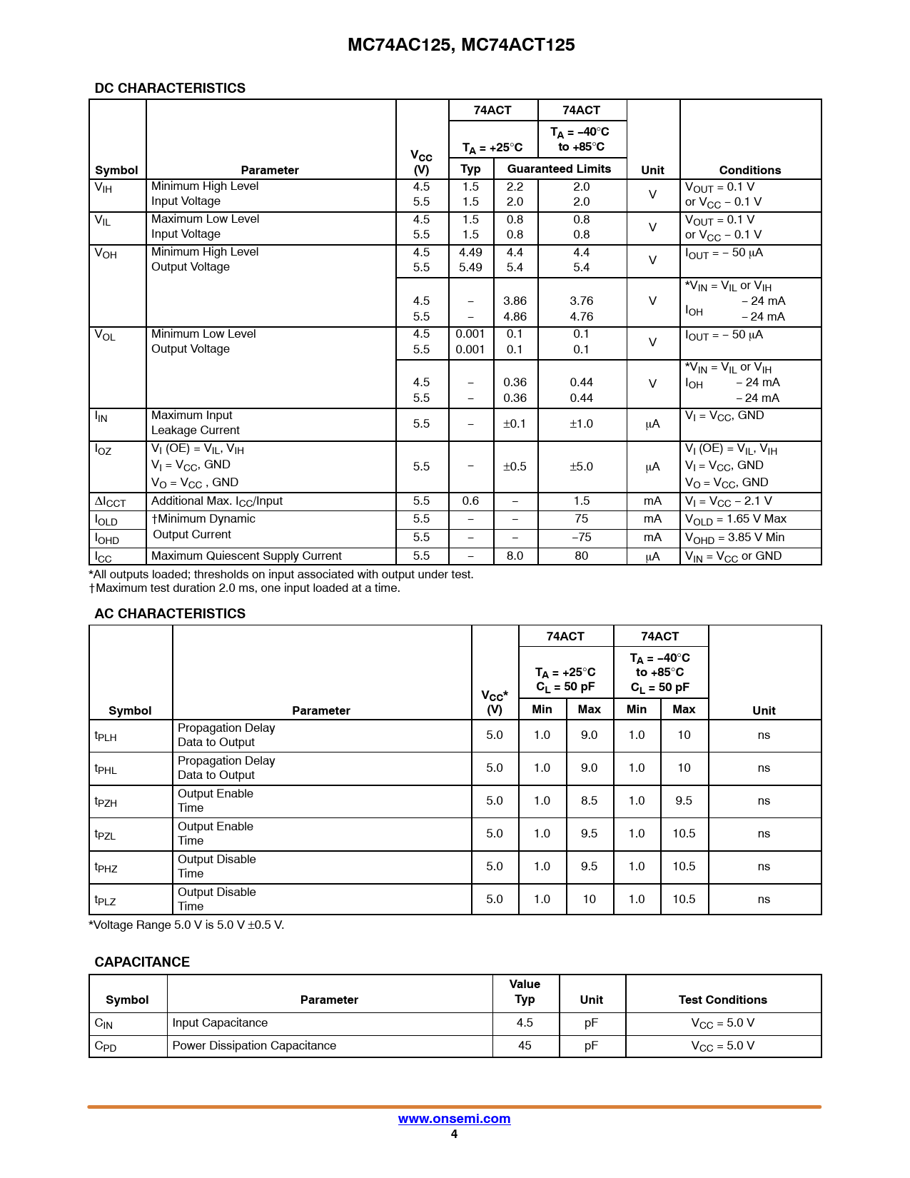 MC74AC125, MC74ACT125DC CHARACTERISTICS74ACT74ACTTA = −40 ° Cto +85 ° CVTA = +25 ° CCCSymbolParameter(V)TypGuaranteed LimitsUnitConditions VIH Minimum High Level 4.5 1.5 2.2 2.0 VOUT = 0.1 V Input Voltage V 5.5 1.5 2.0 2.0 or VCC − 0.1 V VIL Maximum Low Level 4.5 1.5 0.8 0.8 VOUT = 0.1 V Input Voltage V 5.5 1.5 0.8 0.8 or VCC − 0.1 V VOH Minimum High Level 4.5 4.49 4.4 4.4 IOUT = − 50 mA Output Voltage V 5.5 5.49 5.4 5.4 *VIN = VIL or VIH 4.5 − 3.86 3.76 V − 24 mA IOH 5.5 − 4.86 4.76 − 24 mA VOL Minimum Low Level 4.5 0.001 0.1 0.1 IOUT = − 50 mA Output Voltage V 5.5 0.001 0.1 0.1 *VIN = VIL or VIH 4.5 − 0.36 0.44 V IOH − 24 mA 5.5 − 0.36 0.44 − 24 mA IIN Maximum Input VI = VCC, GND Leakage Current 5.5 − ±0.1 ±1.0 mA IOZ VI (OE) = VIL, VIH VI (OE) = VIL, VIH VI = VCC, GND 5.5 − ±0.5 ±5.0 mA VI = VCC, GND VO = VCC , GND VO = VCC, GND DICCT Additional Max. ICC/Input 5.5 0.6 − 1.5 mA VI = VCC − 2.1 V IOLD †Minimum Dynamic 5.5 − − 75 mA VOLD = 1.65 V Max I Output Current OHD 5.5 − − −75 mA VOHD = 3.85 V Min ICC Maximum Quiescent Supply Current 5.5 − 8.0 80 mA VIN = VCC or GND *All outputs loaded; thresholds on input associated with output under test. †Maximum test duration 2.0 ms, one input loaded at a time. AC CHARACTERISTICS74ACT74ACTTA = −40 ° CTA = +25 ° Cto +85 ° CCCVL = 50 pFL = 50 pFCC*SymbolParameter(V)MinMaxMinMaxUnit t Propagation Delay PLH 5.0 1.0 9.0 1.0 10 ns Data to Output t Propagation Delay PHL 5.0 1.0 9.0 1.0 10 ns Data to Output t Output Enable PZH 5.0 1.0 8.5 1.0 9.5 ns Time t Output Enable PZL 5.0 1.0 9.5 1.0 10.5 ns Time t Output Disable PHZ 5.0 1.0 9.5 1.0 10.5 ns Time t Output Disable PLZ 5.0 1.0 10 1.0 10.5 ns Time *Voltage Range 5.0 V is 5.0 V ±0.5 V. CAPACITANCEValueSymbolParameterTypUnitTest Conditions CIN Input Capacitance 4.5 pF VCC = 5.0 V CPD Power Dissipation Capacitance 45 pF VCC = 5.0 V www.onsemi.com4