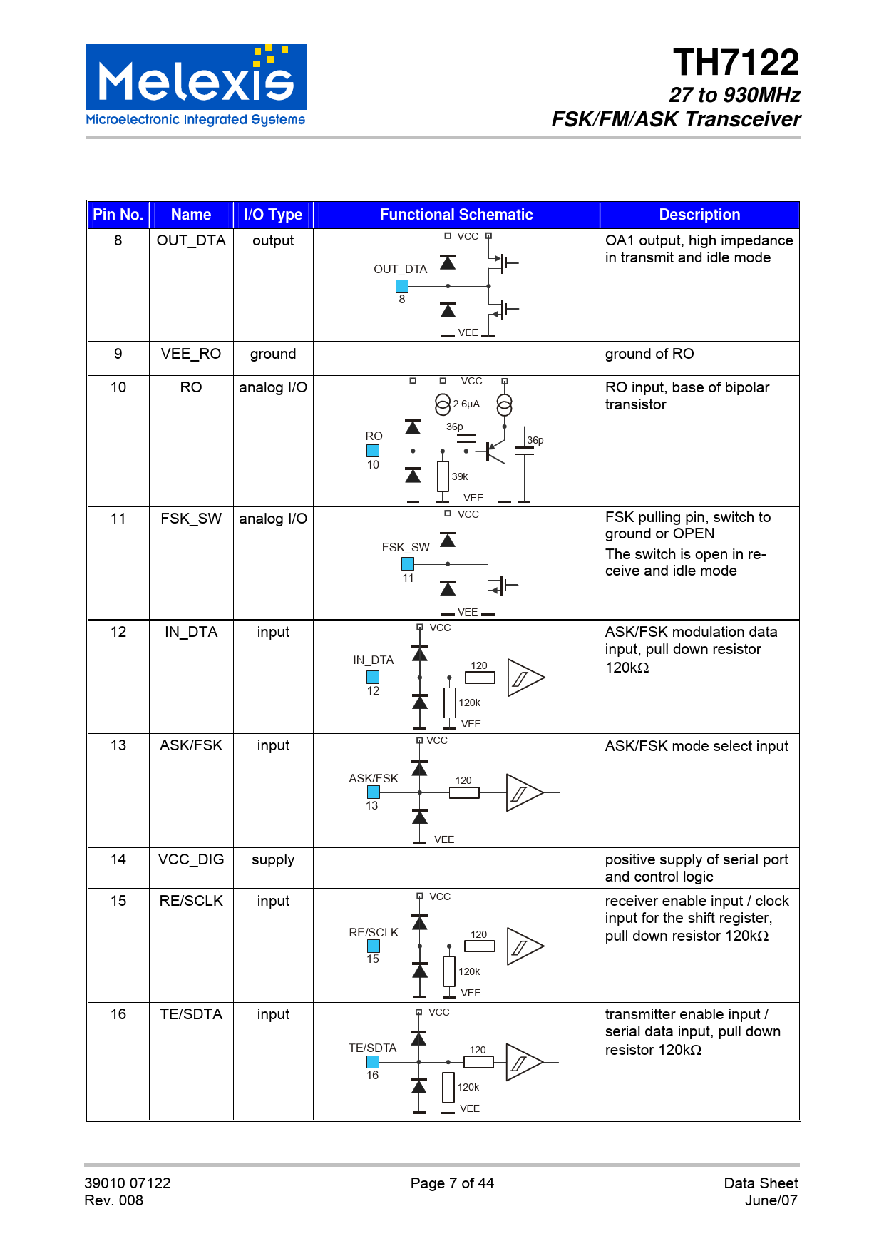 TH712227 to 930MHzFSK/FM/ASK TransceiverPin No.NameI/O TypeFunctional SchematicDescription 8 OUT_DTA output VCC OA1 output, high impedance in transmit and idle mode OUT_DTA 8 VEE 9 VEE_RO ground ground of RO 10 RO analog I/O VCC RO input, base of bipolar 2.6µA transistor 36p RO 36p 10 39k VEE 11 FSK_SW analog I/O VCC FSK pulling pin, switch to ground or OPEN FSK_SW The switch is open in re- ceive and idle mode 11 VEE 12 IN_DTA input VCC ASK/FSK modulation data input, pull down resistor IN_DTA 120 120kΩ 12 120k VEE 13 ASK/FSK input VCC ASK/FSK mode select input ASK/FSK 120 13 VEE 14 VCC_DIG supply positive supply of serial port and control logic 15 RE/SCLK input VCC receiver enable input / clock input for the shift register, RE/SCLK 120 pull down resistor 120kΩ 15 120k VEE 16 TE/SDTA input VCC transmitter enable input / serial data input, pull down TE/SDTA 120 resistor 120kΩ 16 120k VEE 39010 07122 Page 7 of 44 Data Sheet Rev. 008 June/07 Document Outline Features Ordering Information Application Examples Pin Description General Description Document Content 1 Theory of Operation 1.1 General 1.2 Technical Data Overview 1.3 Note on ASK Operation 1.4 Block Diagram 1.5 User Mode Features 2 Pin Definitions and Descriptions 3 Functional Description 3.1 PLL Frequency Synthesizer 3.1.1 Reference Oscillator (XOSC) 3.1.2 Reference Divider 3.1.3 Feedback Divider 3.1.4 Frequency Resolution and Operating Frequency 3.1.5 Phase-Frequency Detector 3.1.6 Lock Detector 3.1.7 Voltage Controlled Oscillator with external Loop Filter 3.1.8 Loop Filter Receiver Part 3.2.1 LNA 3.2.2 Mixer 3.2.3 IF Amplifier 3.2.4 ASK Demodulator 3.2.5 FSK Demodulator 3.3 Transmitter Part 3.3.1 Power Amplifier Output Power Adjustment 3.3.3 Modulation Schemes 3.3.4 ASK Modulation 3.3.5 FSK Modulation 3.3.6 Crystal Tuning 4 Description of User Modes 4.1 Stand-alone User Mode Operation 4.1.1 Frequency Selection 4.1.2 Operation Mode 4.1.3 Modulation Type 4.1.4 LNA Gain Mode 4.2 Programmable User Mode Operation 4.2.1 Serial Control Interface Description 5 Register Description 5.1 Register Overview 5.1.1 Default Register Settings for FS0, FS1 5.1.2 A – word 5.1.3 B – word 5.1.4 C – word 5.1.5 D – word 6 Technical Data 6.1 Absolute Maximum Ratings 6.2 Normal Operating Conditions 6.3 DC Characteristics 6.4 PLL Synthesizer Timings 6.5 AC Characteristics of the Receiver Part 6.6 AC Characteristics of the Transmitter Part 6.7 Serial Control Interface 6.8 Crystal Parameters 7 Application Circuit Examples 7.1 FSK Application Circuit Programmable User Mode (internal AFC option) 7.2 FSK Application Circuit Stand-alone User Mode 7.3 FSK Test Circuit Component List (Fig. 14 and Fig. 15) 7.4 ASK Application Circuit Programmable User Mode (normal data slicer option) 7.5 ASK Test Circuit Component List (Fig. 16) 7.6 ASK Application Circuit Programmable User Mode (peak detector option) 7.7 ASK Test Circuit Component List (Fig. 17) 8 Extended Frequency Range 8.1 Board Component List (Fig. 18) 9 TX/RX Combining Network 9.1 Board Component List (Fig. 19) 9.2 Typical LNA S-Parameters in Receive Mode 9.3 LNA Input Impedances in Transmit Mode 10 Package Description 10.1 Soldering Information 11 Reliability Information 12 ESD Precautions Your Notes 13 Disclaimer
