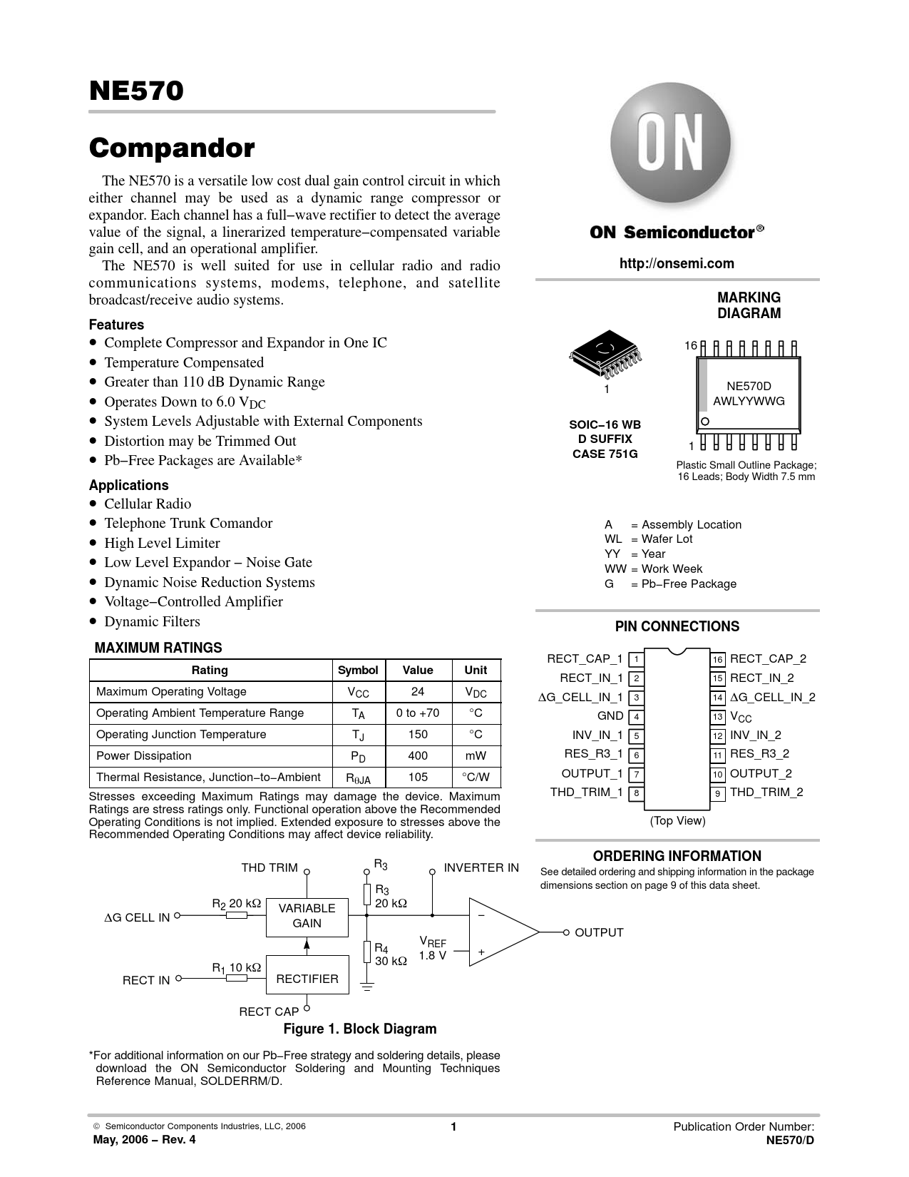 link to page 9 NE570 Compandor The NE570 is a versatile low cost dual gain control circuit in which either channel may be used as a dynamic range compressor or expandor. Each channel has a full−wave rectifier to detect the average value of the signal, a linerarized temperature−compensated variable gain cell, and an operational amplifier. The NE570 is well suited for use in cellular radio and radio