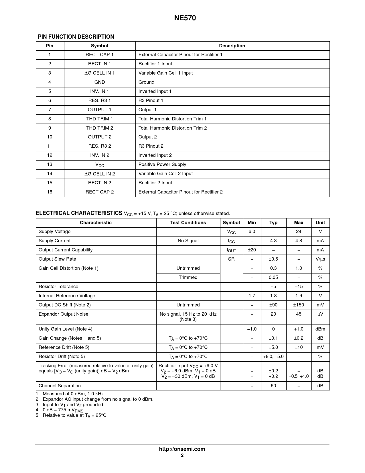 NE570. PIN FUNCTION DESCRIPTION. Pin. Symbol. Description. ELECTRICAL CHARACTERISTICS. Characteristic. Test Conditions. Min. Typ. Max. Unit