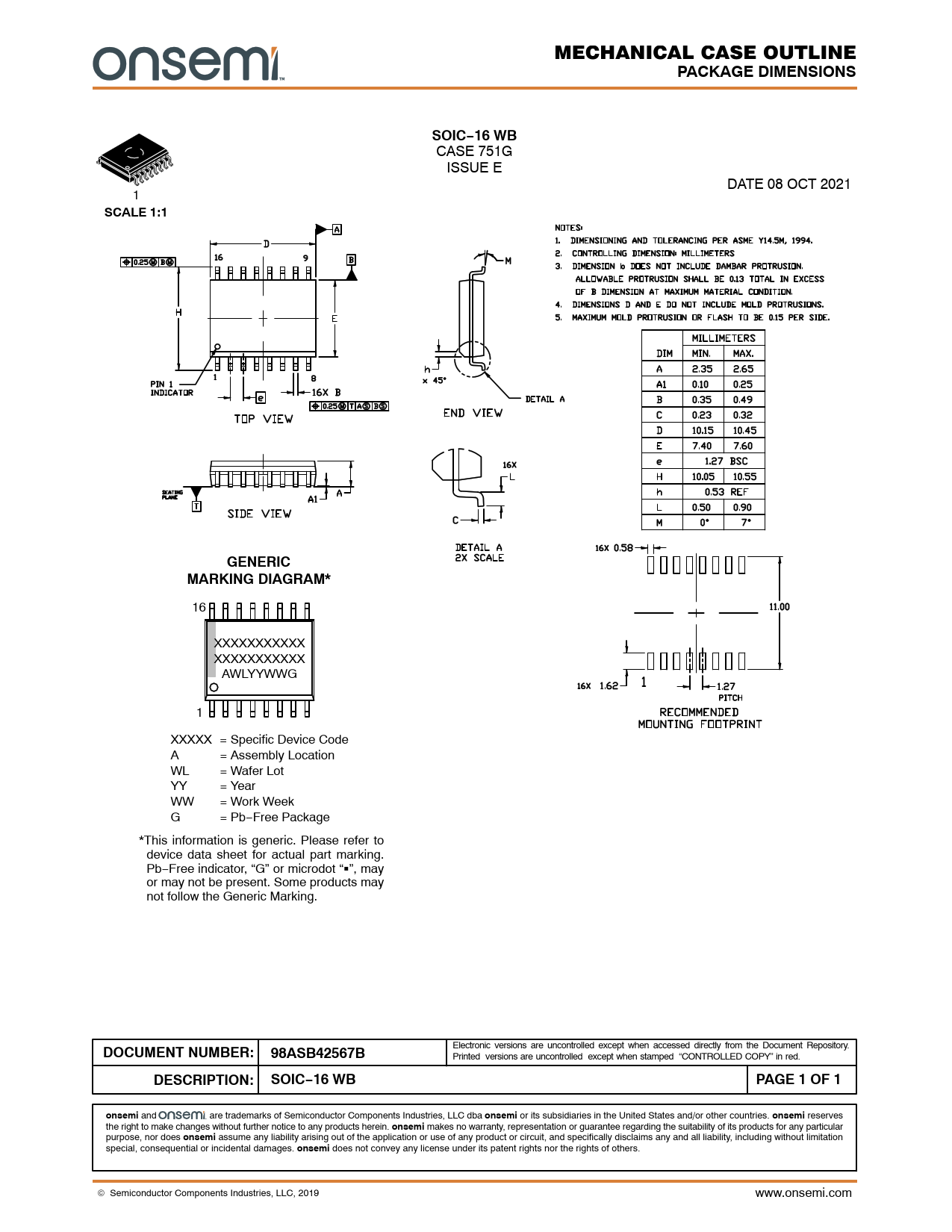 PACKAGE DIMENSIONS. SOIC−16 WB. SCALE 1:1. GENERIC. MARKING DIAGRAM*. DOCUMENT NUMBER: 98ASB42567B. DESCRIPTION:. PAGE 1 OF 1. onsemi