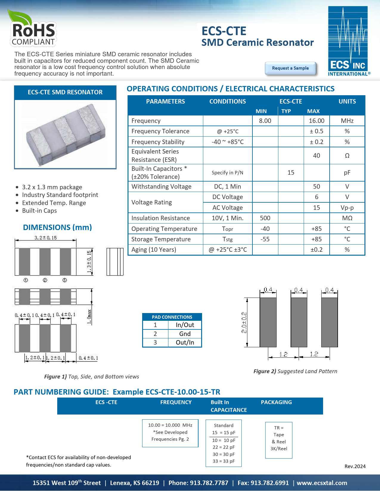 ECS-CTESMD Ceramic Resonator The ECS-CTE Series miniature SMD ceramic resonator includes built in capacitors for reduced component count. The SMD Ceramic resonator is a low cost frequency control solution when absolute Request a Sample frequency accuracy is not important. OPERATING CONDITIONS / ELECTRICAL CHARACTERISTICSECS-CTE SMD RESONATORPARAMETERSCONDITIONSECS-CTEUNITSMINTYPMAX Frequency 8.00 16.00 MHz Frequency Tolerance @ +25°C ± 0.5 % Frequency Stability -40 ~ +85°C ± 0.2 % Equivalent Series 40 Ω Resistance (ESR) Built-In Capacitors * Specify in P/N 15 pF (±20% Tolerance) • 3.2 x 1.3 mm package Withstanding Voltage DC, 1 Min 50 V • Industry Standard footprint DC Voltage 6 V • Extended Temp. Range Voltage Rating AC Voltage 15 Vp-p • Built-in Caps Insulation Resistance 10V, 1 Min. 500 MΩ DIMENSIONS (mm) Operating Temperature Topr -40 +85 °C Storage Temperature Tstg -55 +85 °C Aging (10 Years) @ +25°C ±3°C ±0.2 % PAD CONNECTIONS 1 In/Out 2 Gnd 3 Out/In Figure 2) Suggested Land Pattern Figure 1) Top, Side, and Bottom views PART NUMBERING GUIDE: Example ECS-CTE-10.00-15-TRECS -CTEFREQUENCYBuilt InPACKAGINGCAPACITANCE 10.00 = 10.000 MHz Standard TR = *See Developed 15 = 15 pF Tape Frequencies Pg. 2 10 = 10 pF & Reel 22 = 22 pF 3K/Reel 30 = 30 pF *Contact ECS for availability of non-developed 33 = 33 pF frequen cies/non standard cap values. Rev.2024 15351 West 109th Street | Lenexa, KS 66219 | Phone: 913.782.7787 | Fax: 913.782.6991 | www.ecsxtal.com