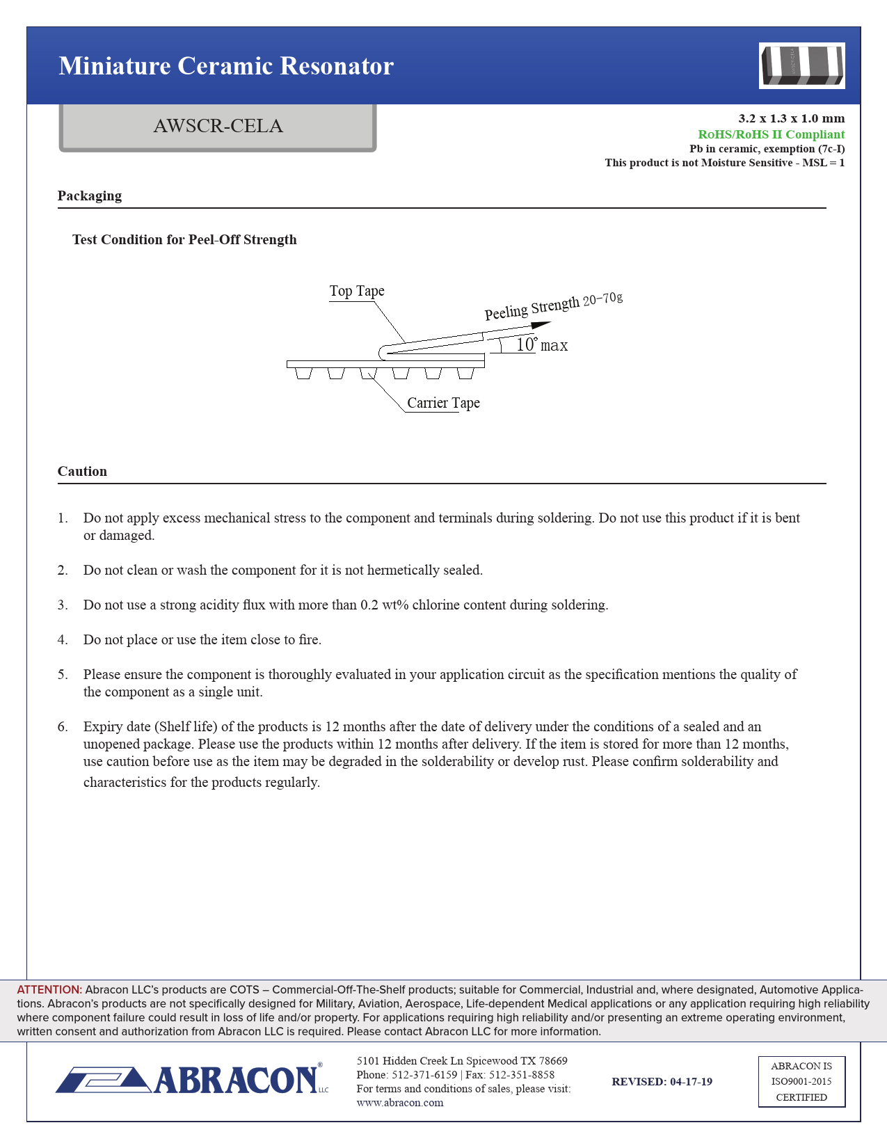 RoHS/RoHS II Compliant Pb in ceramic, exemption (7c-I) This product is not Moisture Sensitive - MSL = 1 Packaging Test Condition for Peel-Off Strength