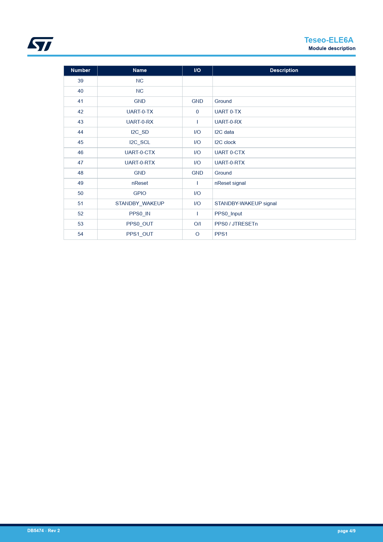 Teseo-ELE6A. Module description. Number. Name. I/O. Description. DB5474. Rev 2. page 4/9