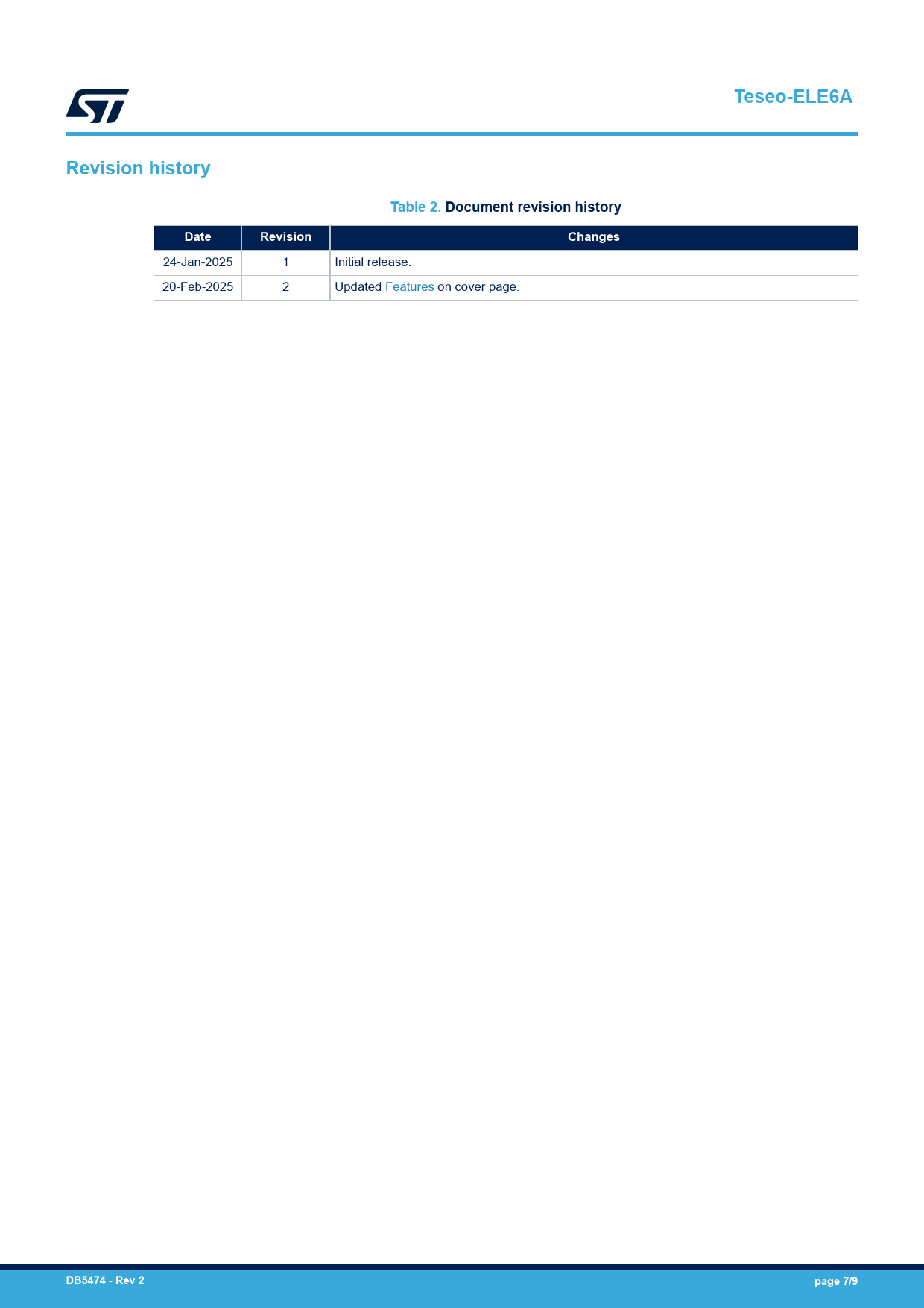 Teseo-ELE6A. Revision history. Table 2. Document revision history. Date. Revision. Changes. DB5474. Rev 2. page 7/9