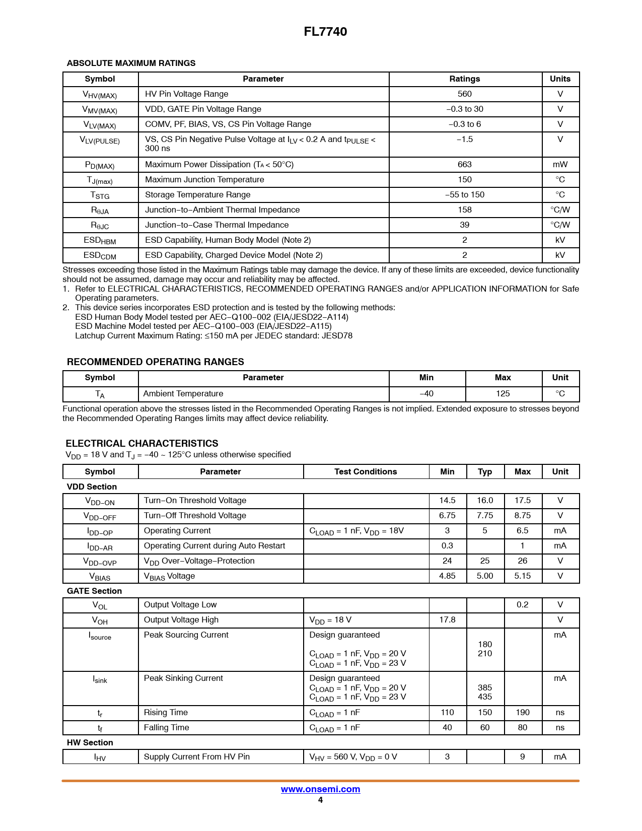 VHV(MAX) HV Pin Voltage Range 560 V VMV(MAX) VDD, GATE Pin Voltage Range −0.3 to 30 V VLV(MAX) COMV, PF, BIAS, VS, CS Pin Voltage Range −0.3 to 6 V VLV(PULSE) VS, CS Pin Negative Pulse Voltage at ILV < 0.2 A and tPULSE < −1.5 V 300 ns PD(MAX) Maximum Power Dissipation (TA < 50°C) 663 mW TJ(max) Maximum Junction Temperature 150 °C TSTG Storage Temperature Range −55 to 150 °C RJA Junction−to−Ambient Thermal Impedance 158 °C/W RJC Junction−to−Case Thermal Impedance 39 °C/W ESDHBM ESD Capability, Human Body Model (Note 2) 2 kV ESDCDM ESD Capability, Charged Device Model (Note 2) 2 kV Stresses exceeding those listed in the Maximum Ratings table may damage the device. If any of these limits are exceeded, device functionality should not be assumed, damage may occur and reliability may be affected. 1. Refer to ELECTRICAL CHARACTERISTICS, RECOMMENDED OPERATING RANGES and/or APPLICATION INFORMATION for Safe Operating parameters. 2. This device series incorporates ESD protection and is tested by the following methods: ESD Human Body Model tested per AEC−Q100−002 (EIA/JESD22−A114) ESD Machine Model tested per AEC−Q100−003 (EIA/JESD22−A115) Latchup Current Maximum Rating: ≤150 mA per JEDEC standard: JESD78