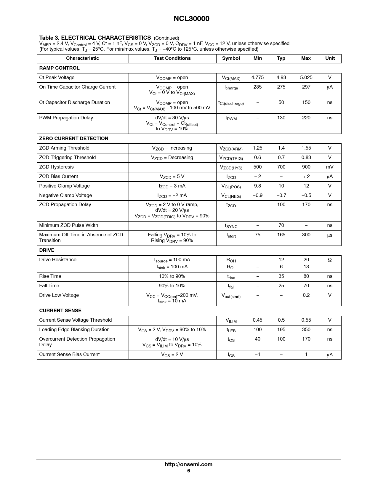 NCL30000. Table 3. ELECTRICAL CHARACTERISTICS. Characteristic. Test Conditions. Symbol. Min. Typ. Max. Unit. RAMP CONTROL