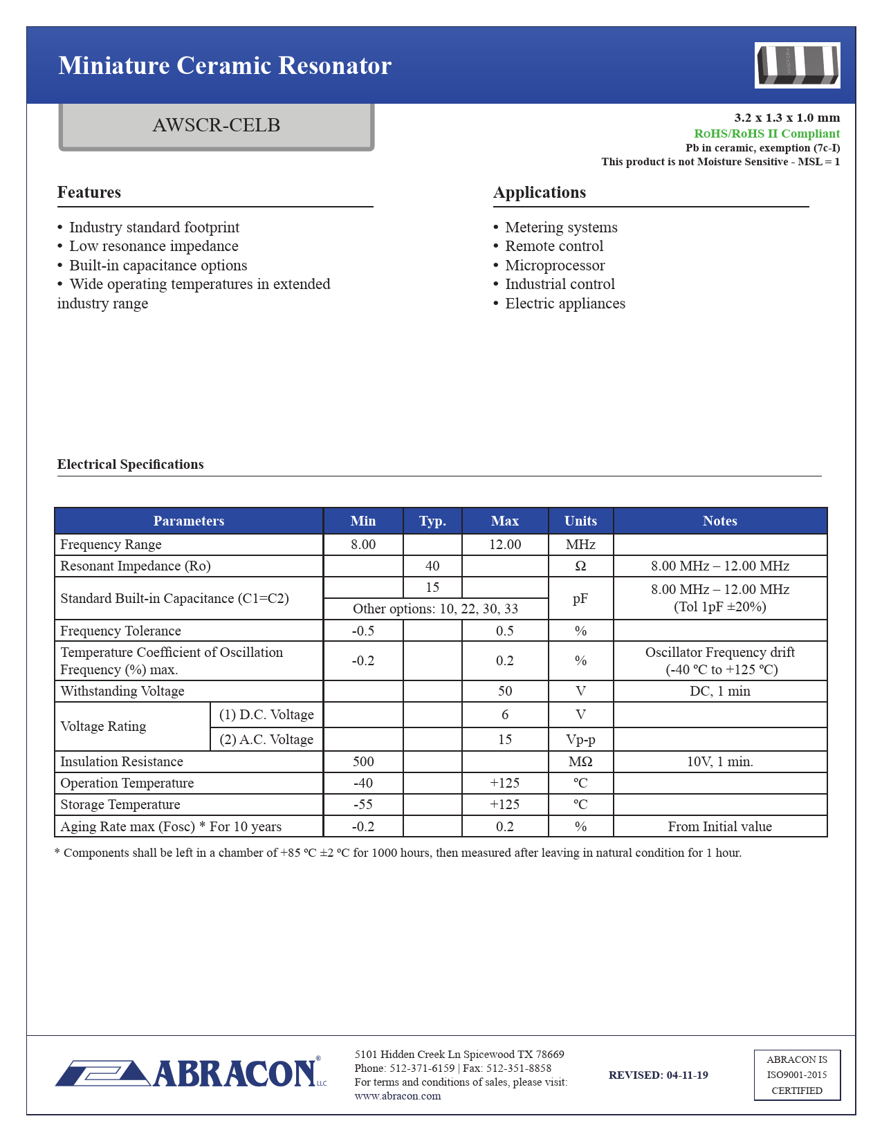 Miniature Ceramic Resonator3.2 x 1.3 x 1.0 mm AWSCR-CELB RoHS/RoHS II CompliantPb in ceramic, exemption (7c-I)This product is not Moisture Sensitive - MSL = 1FeaturesApplications• Industry standard footprint • Metering systems • Low resonance impedance • Remote control • Built-in capacitance options • Microprocessor • Wide operating temperatures in extended • Industrial control industry range • Electric appliances Electrical SpecificationsParametersMinTyp.MaxUnitsNotes Frequency Range 8.00 12.00 MHz Resonant Impedance (Ro) 40 Ω 8.00 MHz – 12.00 MHz 15 Standard Built-in Capacitance (C1=C2) pF 8.00 MHz – 12.00 MHz Other options: 10, 22, 30, 33 (Tol 1pF ±20%) Frequency Tolerance -0.5 0.5 % Temperature Coefficient of Oscillation Frequency (%) max. -0.2 0.2 % Oscillator Frequency drift (-40 ºC to +125 ºC) Withstanding Voltage 50 V DC, 1 min (1) D.C. Voltage 6 V Voltage Rating (2) A.C. Voltage 15 Vp-p Insulation Resistance 500 MΩ 10V, 1 min. Operation Temperature -40 +125 ºC Storage Temperature -55 +125 ºC Aging Rate max (Fosc) * For 10 years -0.2 0.2 % From Initial value * Components shall be left in a chamber of +85 ºC ±2 ºC for 1000 hours, then measured after leaving in natural condition for 1 hour. 5101 Hidden Creek Ln Spicewood TX 78669 ABRACON IS Phone: 512-371-6159 | Fax: 512-351-8858 REVISED: 04-11-19 ISO9001-2015 LLC For terms and conditions of sales, please visit: CERTIFIED www.abracon.com