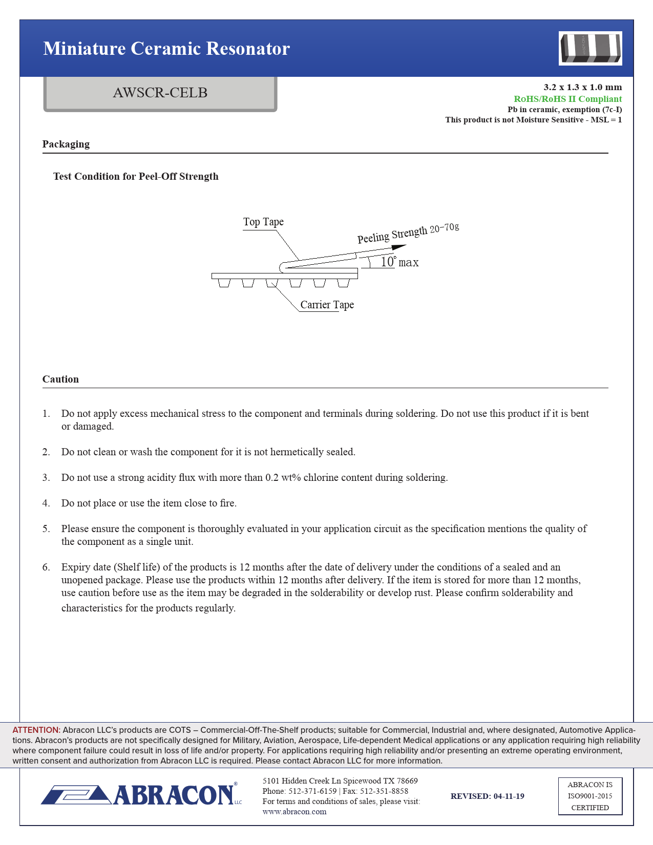 RoHS/RoHS II Compliant Pb in ceramic, exemption (7c-I) This product is not Moisture Sensitive - MSL = 1 Packaging Test Condition for Peel-Off Strength