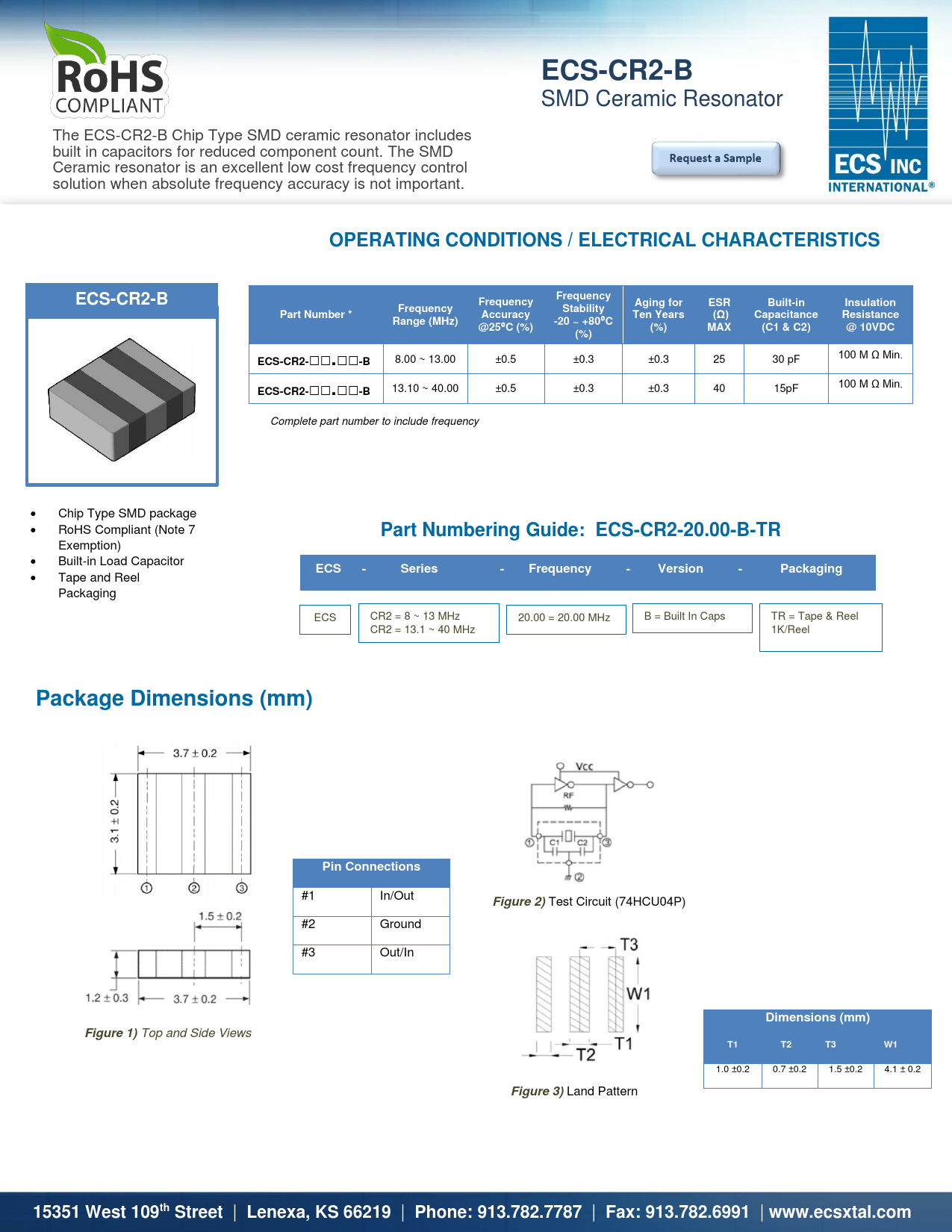 Tape and Reel Packag ing ECS CR2 = 8 ~ 13 MHz 20.00 = 20.00 MHz B = Built In Caps TR = Tape & Reel CR2 = 13.1 ~ 40 MHz 1K/Reel