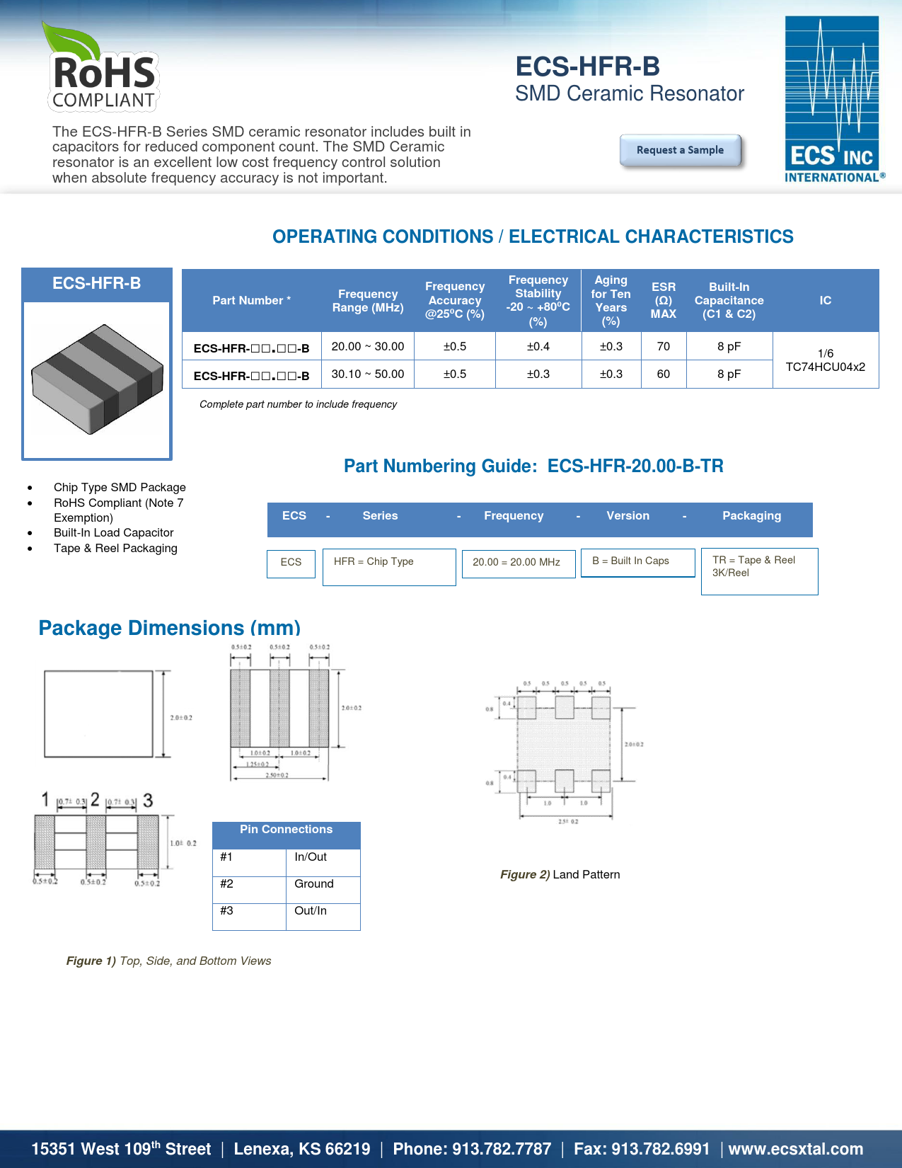 ECS-HFR-B SMD Ceramic Resonator The ECS-HFR-B Series SMD ceramic resonator includes built in capacitors for reduced component count. The SMD Ceramic Request a Sample resonator is an excellent low cost frequency control solution when absolute frequency accuracy is not important. OPERATING CONDITIONS / ELECTRICAL CHARACTERISTICSFrequencyAgingECS-HFR-BFrequencyESRBuilt-InFrequencyStabilityfor TenPart Number *Accuracy(Ω)CapacitanceICRange (MHz)-20 ~ +80⁰CYears@25⁰C (%)MAX(C1 & C2)(%)(%)ECS-HFR-□□.□□-B 20.00 ~ 30.00 ±0.5 ±0.4 ±0.3 70 8 pF 1/6 TC74HCU04x2 ECS-HFR-□□.□□-B 30.10 ~ 50.00 ±0.5 ±0.3 ±0.3 60 8 pF Complete part number to include frequency Part Numbering Guide: ECS-HFR-20.00-B-TR • Chip Type SMD Package • RoHS Co mpliant (Note 7 Exemption) ECS - Series - Frequency - Version - Packaging • Built-In L oad Capacitor • Tape & Reel Packaging ECS HFR = Chip Type B = Built In Caps TR = Tape & Reel 20.00 = 20.00 MHz 3K/Reel Package Dimensions (mm)Pin Connections #1 In/Out Figure 2) Land Pattern #2 Ground #3 Out/In Figure1) Top, Side, and Bottom Views 15351 West 109th Street | Lenexa, KS 66219 | Phone: 913.782.7787 | Fax: 913.782.6991 | www.ecsxtal.com