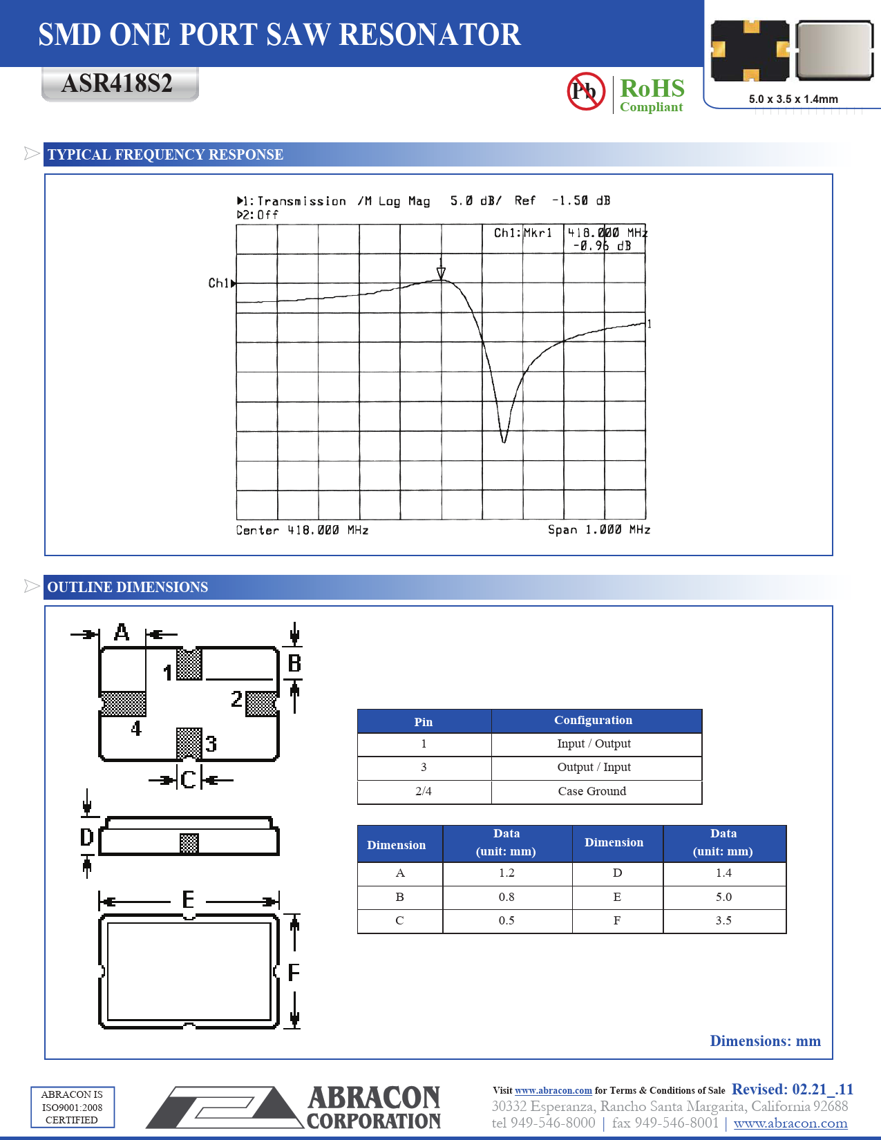 SMD ONE PORT SAW RESONATOR. ASR418S2. Pb RoHS. Compliant. 5.0 x 3.5 x 1.4mm. TYPICAL FREQUENCY RESPONSE. OUTLINE DIMENSIONS. Pin