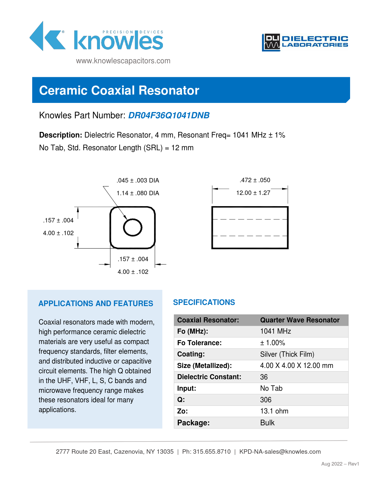 Ceramic Coaxial. Resonator. DR04F36Q1041DNB. Description:. APPLICATIONS AND FEATURES. SPECIFICATIONS. Coaxial Resonator:
