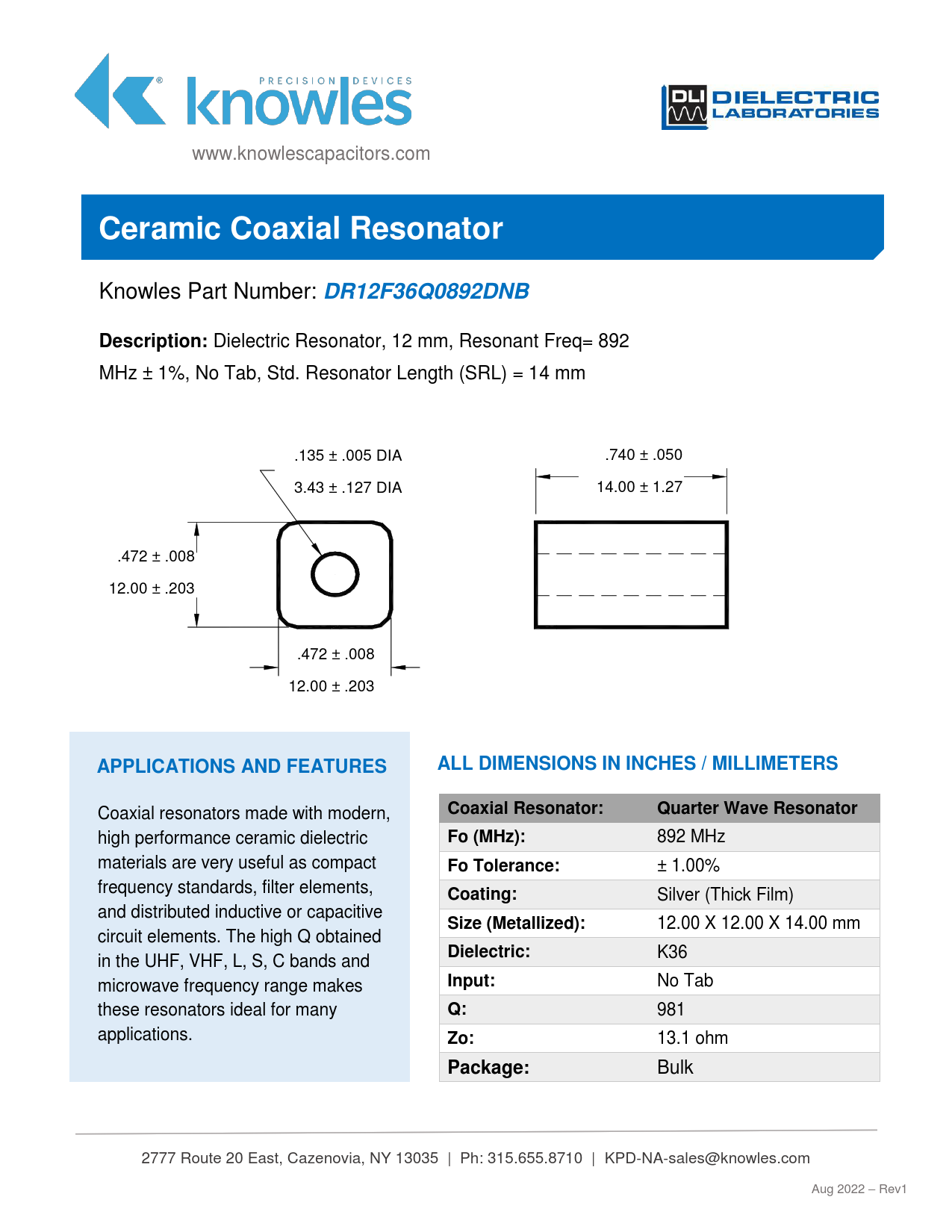 www.knowlescapacitors.com www.knowlescapacitors.com www.knowlescapacitors.com Ceramic CoaxialResonator Knowles Part Number: DR12F36Q0892DNBDescription: Dielectric Resonator, 12 mm, Resonant Freq= 892 MHz ± 1%, No Tab, Std. Resonator Length (SRL) = 14 mm .135 ± .005 DIA .740 ± .050 3.43 ± .127 DIA 14.00 ± 1.27 .472 ± .008 12.00 ± .203 .472 ± .008 12.00 ± .203 APPLICATIONS AND FEATURESALL DIMENSIONS IN INCHES / MILLIMETERSCoaxial Resonator:Quarter Wave Resonator Coaxial resonators made with modern, high performance ceramic dielectric Fo (MHz): 892 MHz materials are very useful as compact Fo Tolerance: ± 1.00% frequency standards, filter elements, Coating: Silver (Thick Film) and distributed inductive or capacitive Size (Metallized): 12.00 X 12.00 X 14.00 mm circuit elements. The high Q obtained Dielectric: K36 in the UHF, VHF, L, S, C bands and Input: No Tab microwave frequency range makes these resonators ideal for many Q: 981 applications. Zo: 13.1 ohm Package: Bulk 2777 Route 20 East, Cazenovia, NY 13035 | Ph: 315.655.8710 | KPD-NA-sales@knowles.com Aug 2022 – Rev1