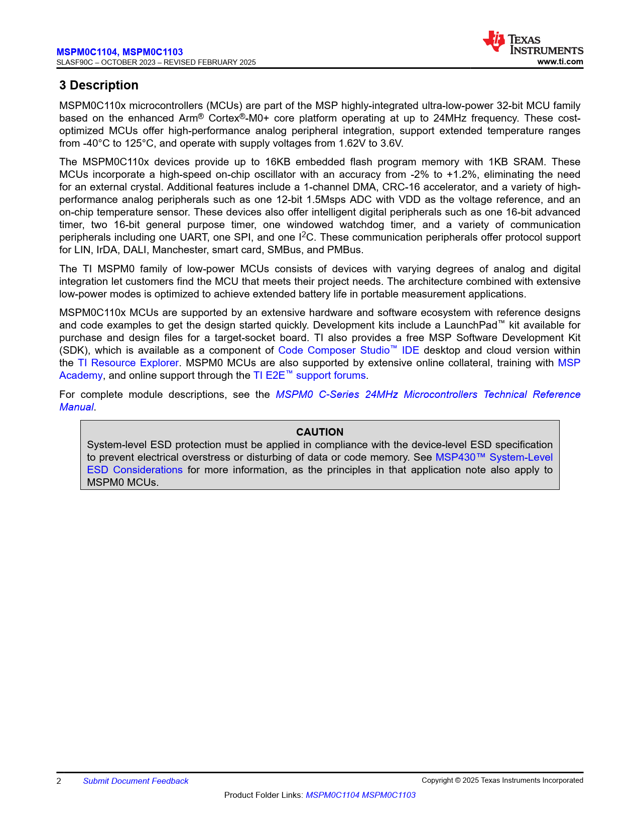 MSPM0C1104. , MSPM0C1103. www.ti.com. 3 Description. CAUTION